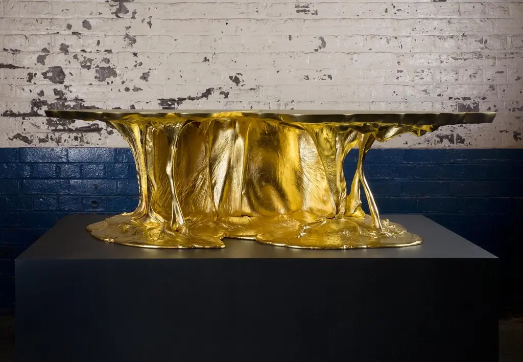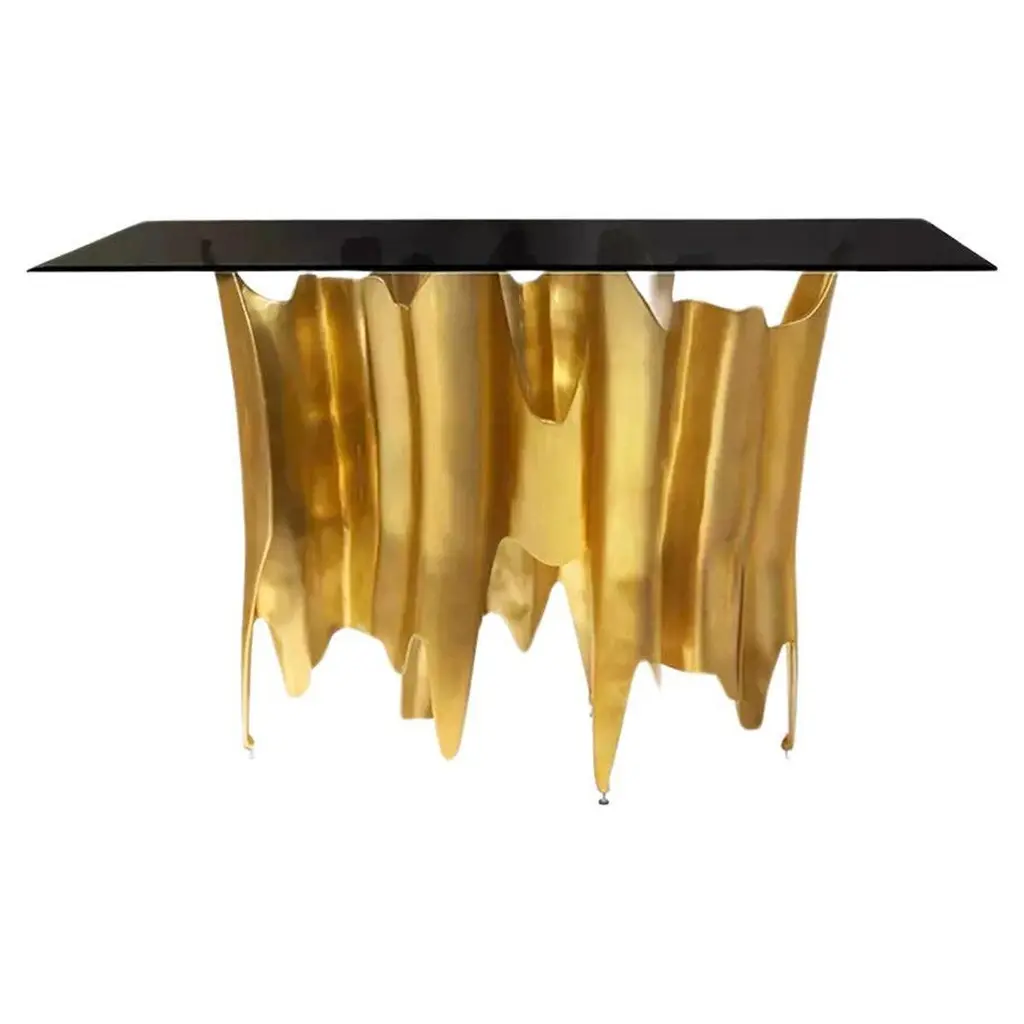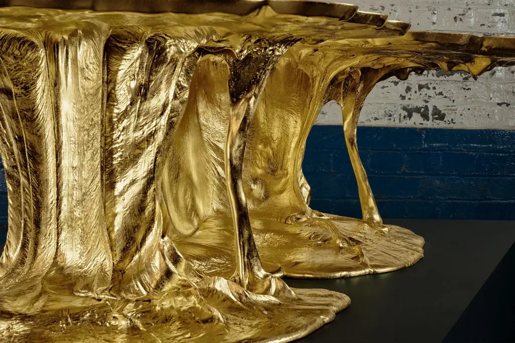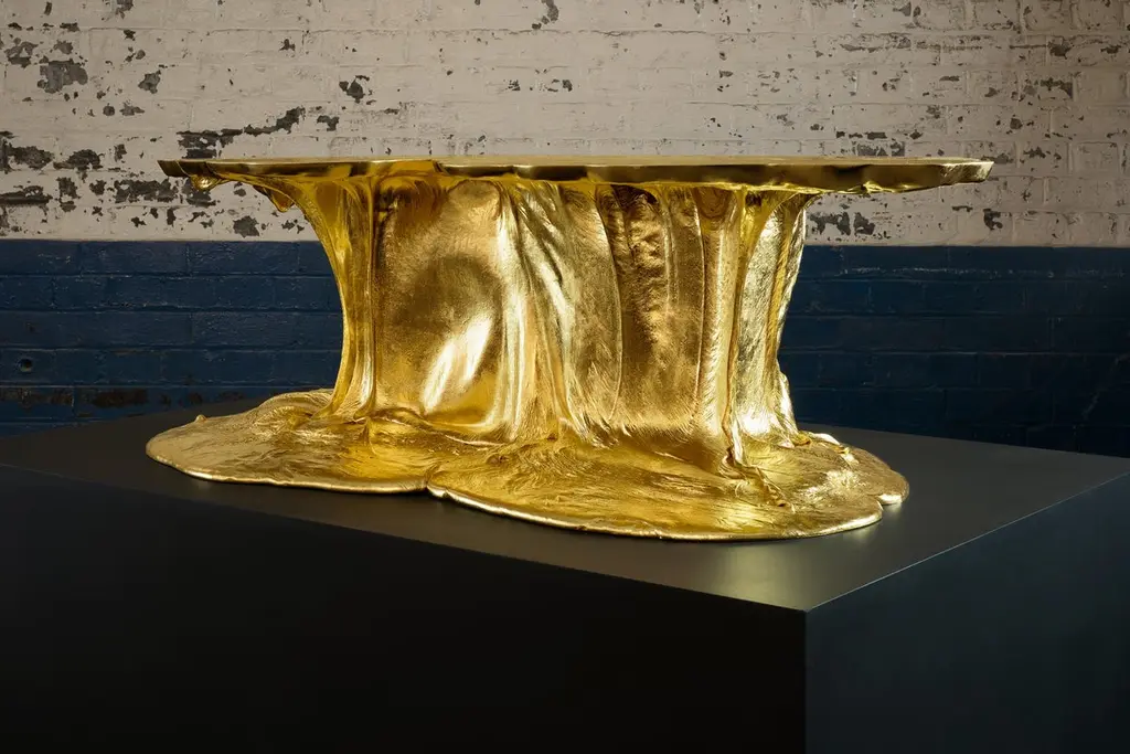 Abstraction II Coffee Table by Kris Lamba StudioDimensions: W 150 x D 80 x H 45 cmMaterials: 24ct gold, bio-polymer.Weight: 60 Kg.Kris Lamba was born in London in 1984. He creates large and small-scale sculpture, paintings and edition based collectible design. Eschewing tradition media, he works with a variety of industrial biopolymers which Lamba manipulates whilst still molten, often at extreme temperatures. Using a combination of great force, gravity and a pioneering technique of polymer-stretching, he creates otherworldly forms; shapes that defy convention and echo the spontaneous and often violent moments of interstellar creation. Aiming to partly remove the element of ‘self’ Lamba adjusts only certain parameters: temperature, quantity, molecular weight and the applied force. Then, using custom designed machinery he pulls apart the molten material, selectively freezing and re-heating where necessary; the resulting shapes seemingly grown rather than made. After a period of consideration, the forms are refined and re-worked over a period of weeks and are either cast in bronze using the traditional ‘lost-wax’ method, or are finished in precious metals, pigment rich paints and composite resin fabrics.Creating work is an energetic process for Lamba, his pieces becoming expressions of a singularity; ideas forged though intense experimentation, later undergoing gradual stages of refinement and craftsmanship. Originally a trained classical percussionist Lamba then went on to study contemporary design. His stretched and manipulated sculptures can be seen as a rebellion against the confines of working within tradition; their spontaneous forms defying and reworking traditional artistic practice. His recent series of raw pigment sculptures go further to reinforce this point, warping the very space that they occupy. Lamba’s work has been published worldwide to widespread critical acclaim and is held in several prominent collections. He currently lives and works near Brighton, UK.