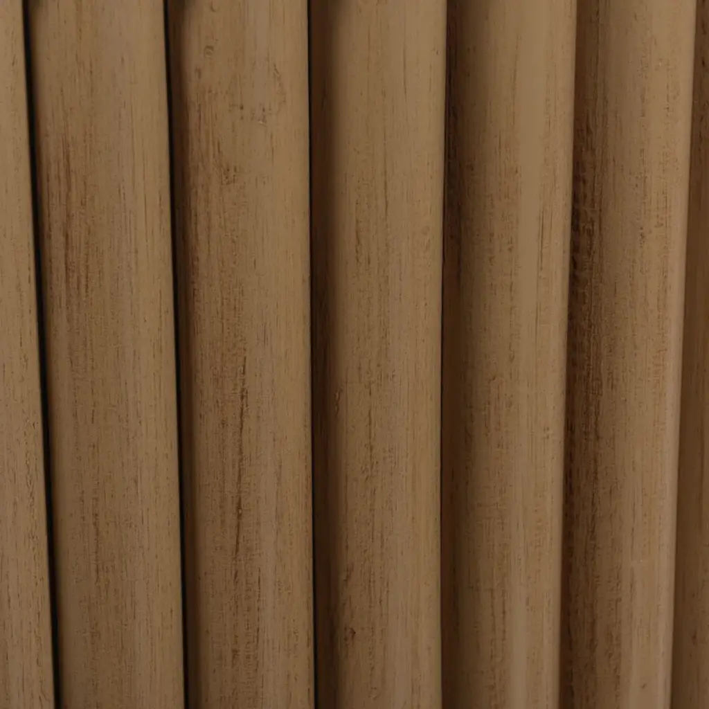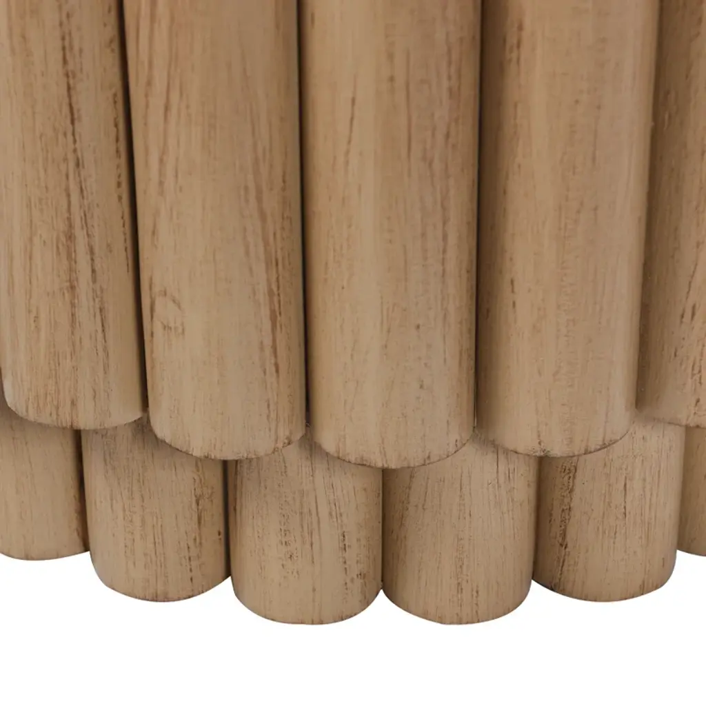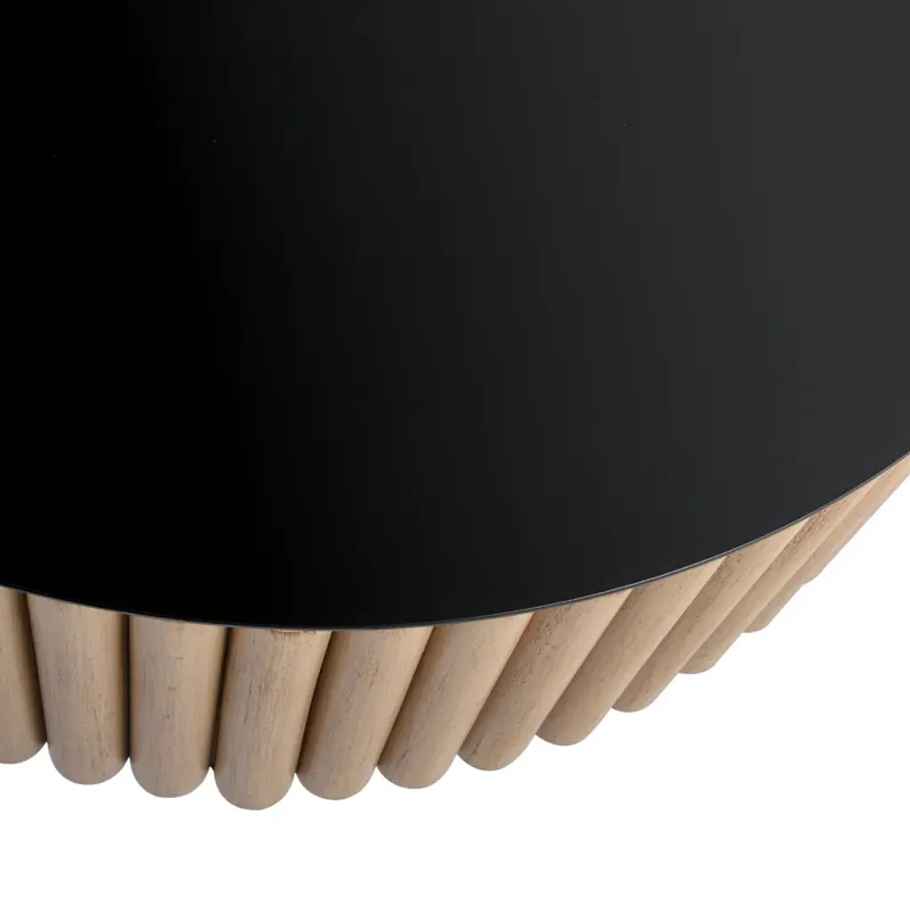 This drum-shaped table features a pinewood fluted trim surrounding the exterior for a barrel design. The pine wood has a natural stain finish for a rustic look that contrasts against the black glass tabletop. The tabletop comes connected to the base so there's no risk of slipping/falling off and getting damaged. Due to the production process, there may be minor variations in shape, size, color, and finish.