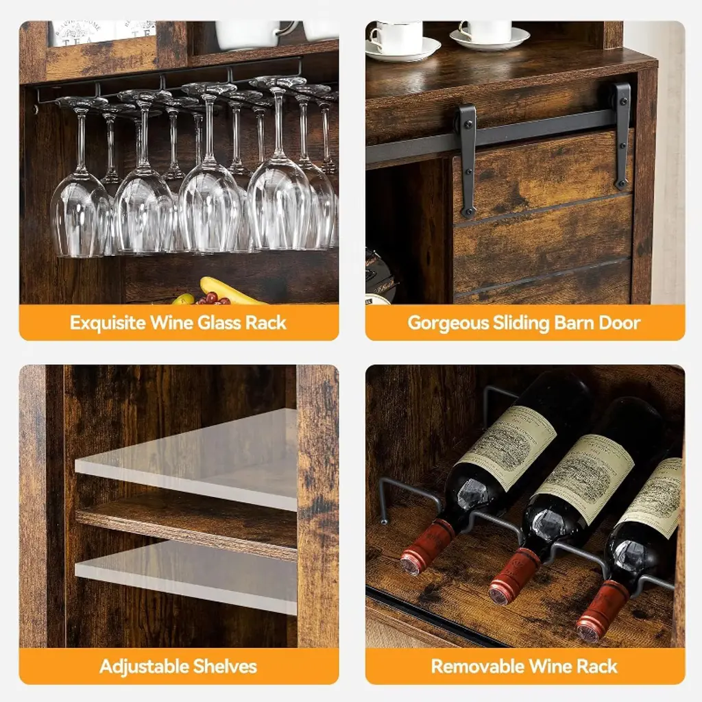 Acekool 70" Wine Bar Cabinet With Storage Hutch, Adjustable Shelves, Glass Racks, Buffet Coffee Bar, Rustic Brown