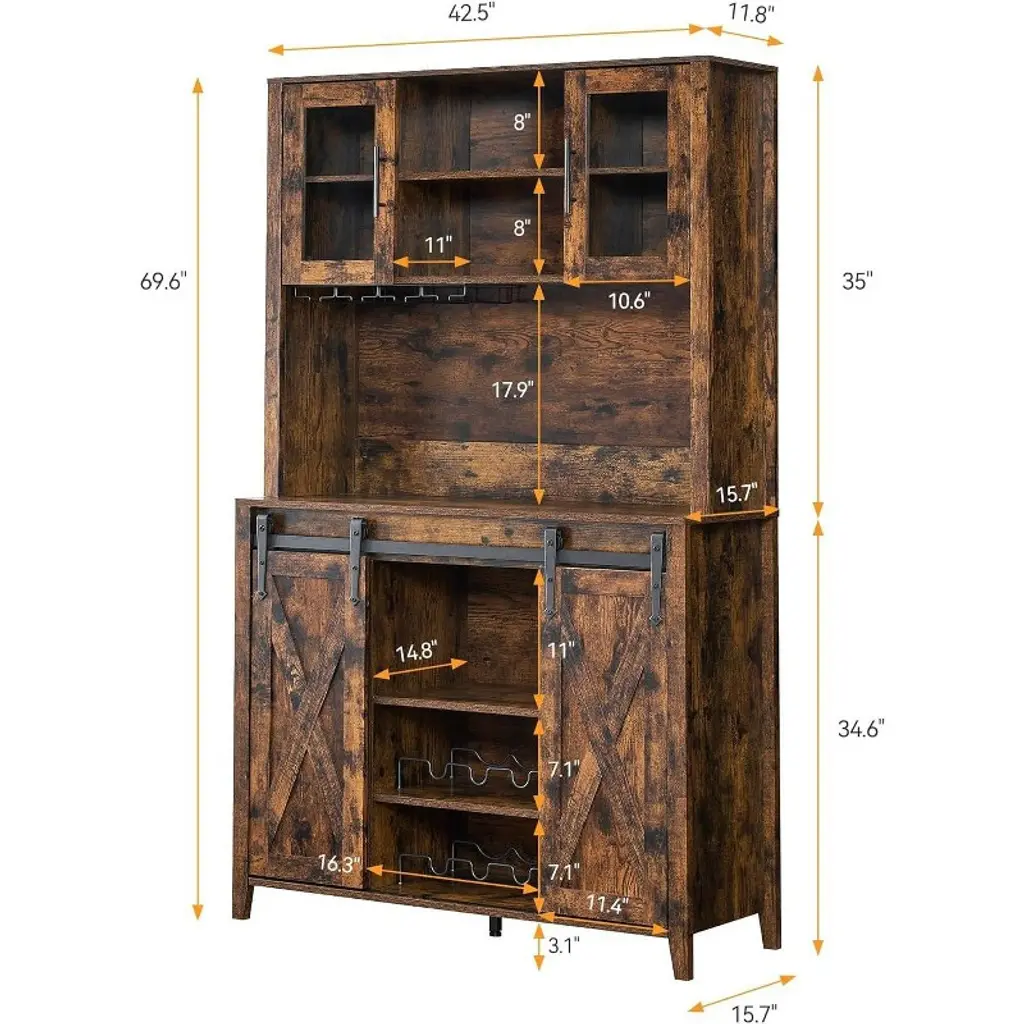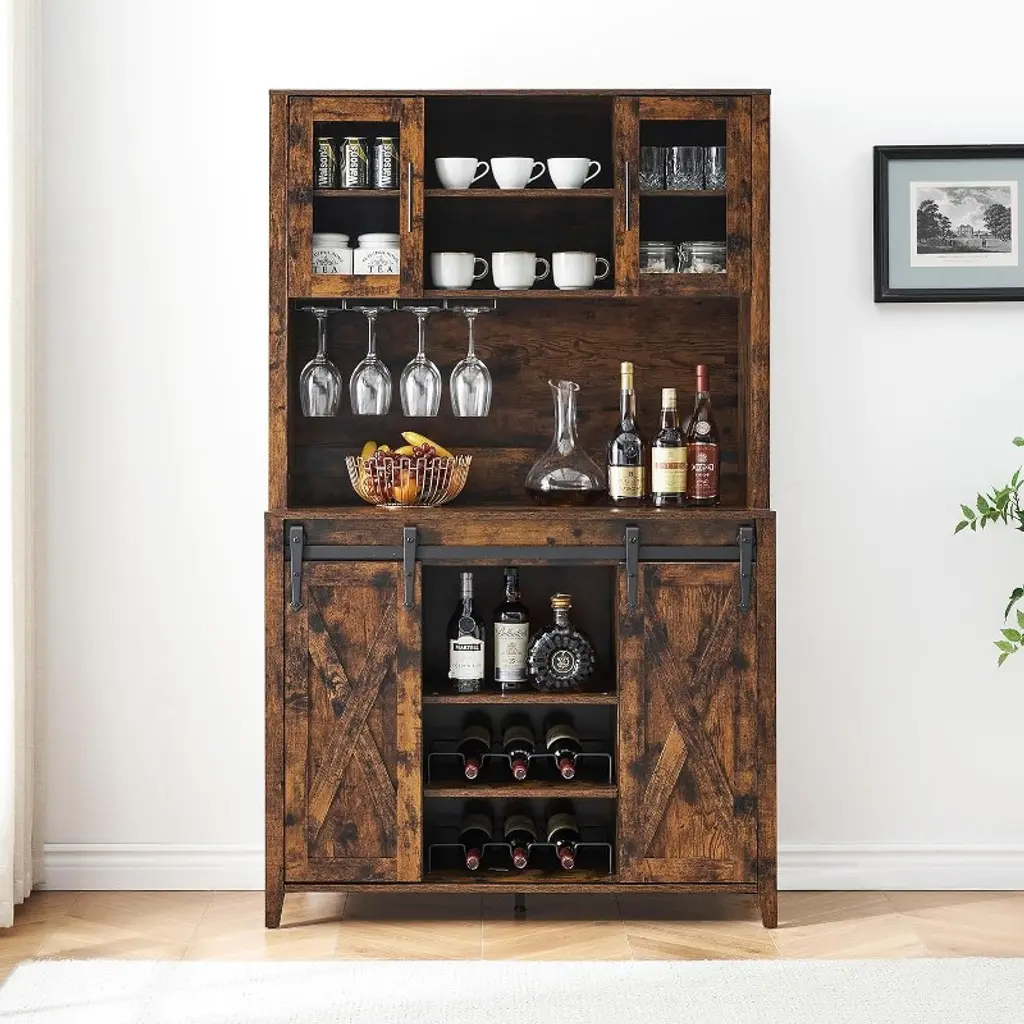 Bring both function and character to your home with the Acekool 70" wine bar cabinet. This tall storage piece features farmhouse-inspired style, a spacious hutch, and a wide buffet counter, keeping your space organized while creating a welcoming focal point in any room. The top hutch provides a mix of open shelves and glass-door compartments, making it easy to store and display glassware, dishes, or collectibles. Below, the buffet area has seven adjustable shelves to fit bottles, kitchenware, snacks, and more. The generous countertop is designed to hold small appliances or display your favorite decor. Panels move smoothly to keep your items neat and easy to access. Built for daily living, this cabinet features a stable frame with reinforced links and extra support legs for added strength. The scratch-resistant finish makes cleanup easy and helps maintain a fresh look. All instructions and hardware are included for simple, stress-free assembly. With its versatile design, this cabinet is a smart addition to kitchens, dining rooms, or living spaces that need flexible storage and classic style.
