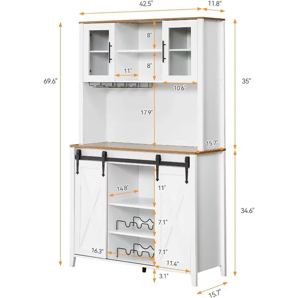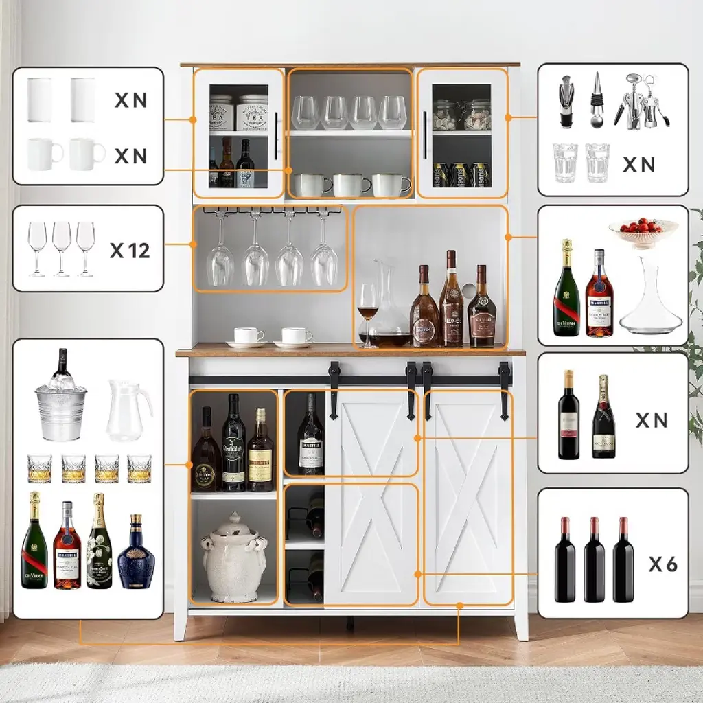 Bring both function and character to your home with the Acekool 70" wine bar cabinet. This tall storage piece features farmhouse-inspired sliding barn doors, a spacious hutch, and a wide buffet counter, helping you stay organized while adding a welcoming focal point to any room. The top hutch provides a mix of open shelves and glass-door compartments for easy storage and display of glassware, dishes, or collectibles. Below, the buffet includes seven adjustable shelves, so you can fit bottles, kitchenware, snacks, and more. The generous countertop is designed to hold small appliances or showcase your favorite decor. Sliding barn doors glide smoothly to keep your items neat and accessible. Built for everyday living, this cabinet features a stable frame with reinforced links and extra support legs for dependability. The scratch-resistant finish makes cleaning simple and keeps your cabinet looking great over time. All assembly instructions and hardware are included to make setup easy and stress-free. With its versatile design, this cabinet is a smart choice for kitchens, dining rooms, and living spaces looking for flexible storage and classic style.