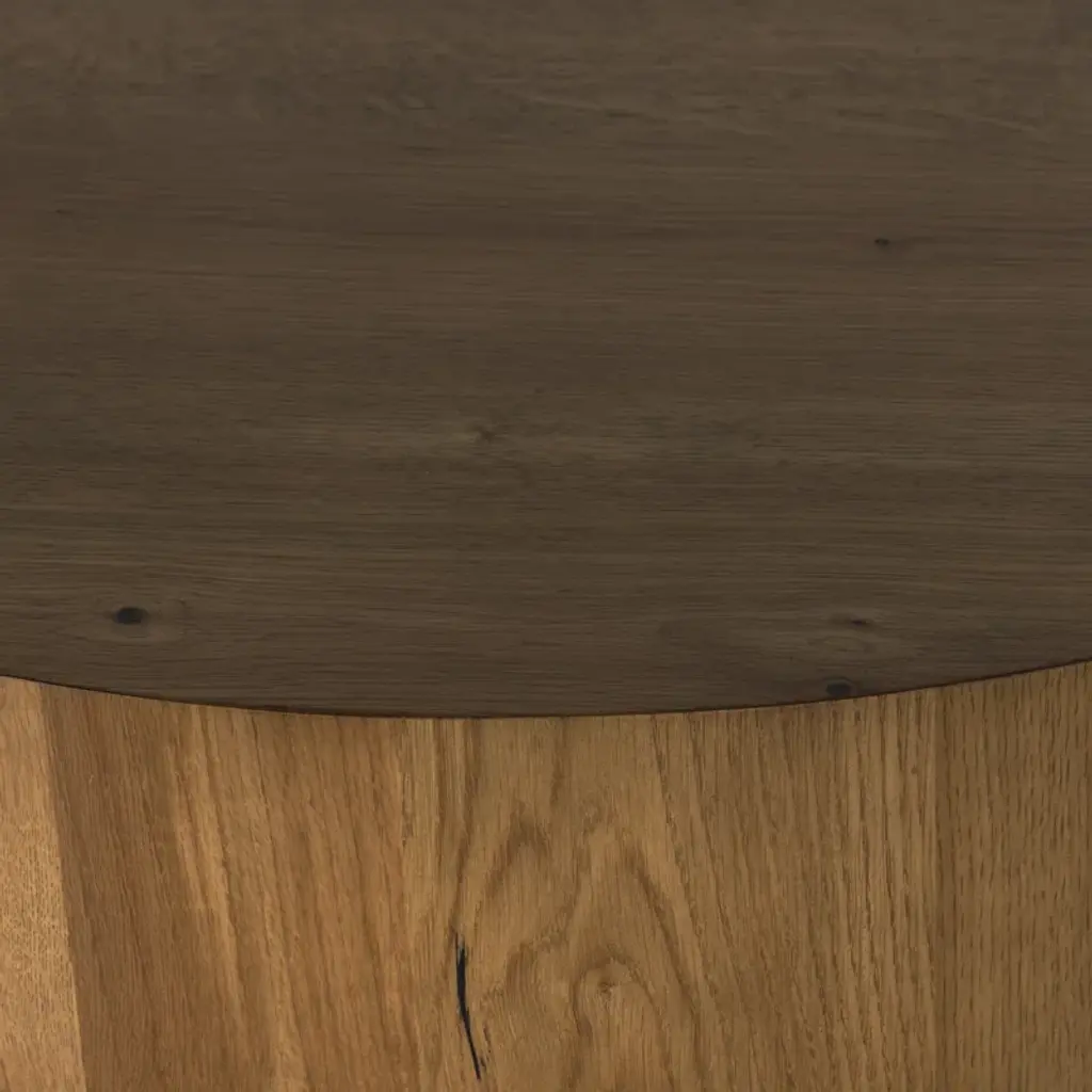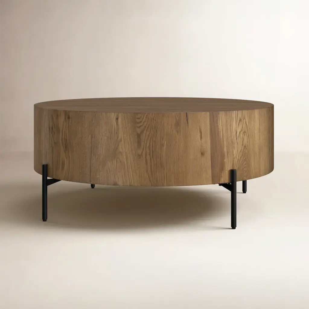 This round coffee table is the perfect centerpiece for your conversation area. The thick top is crafted from solid wood with a warm finish, and it's held aloft by a 4-leg iron cross base in a dark gunmetal tone for plenty of contrast. It strikes a classic drum silhouette and has a surface roomy enough for décor – or placemats if you want to eat in front of your favorite streaming series.