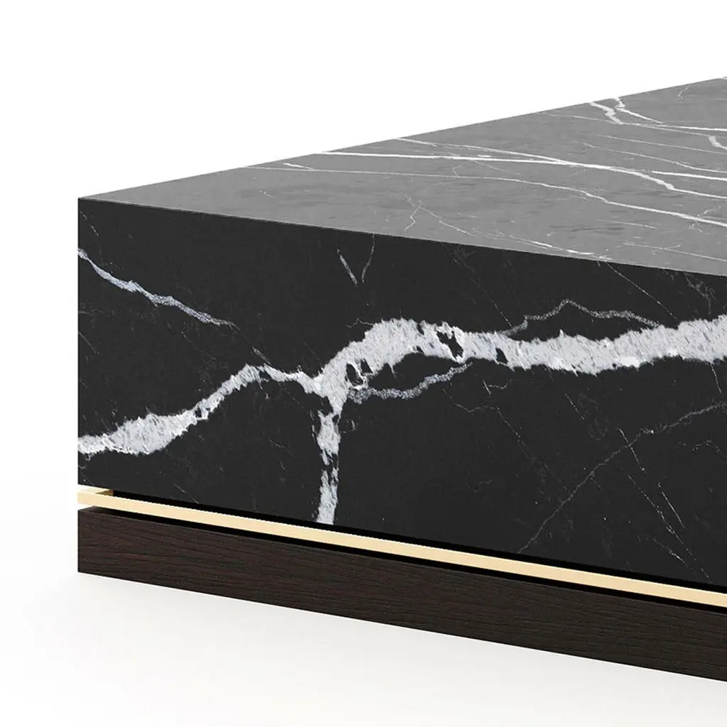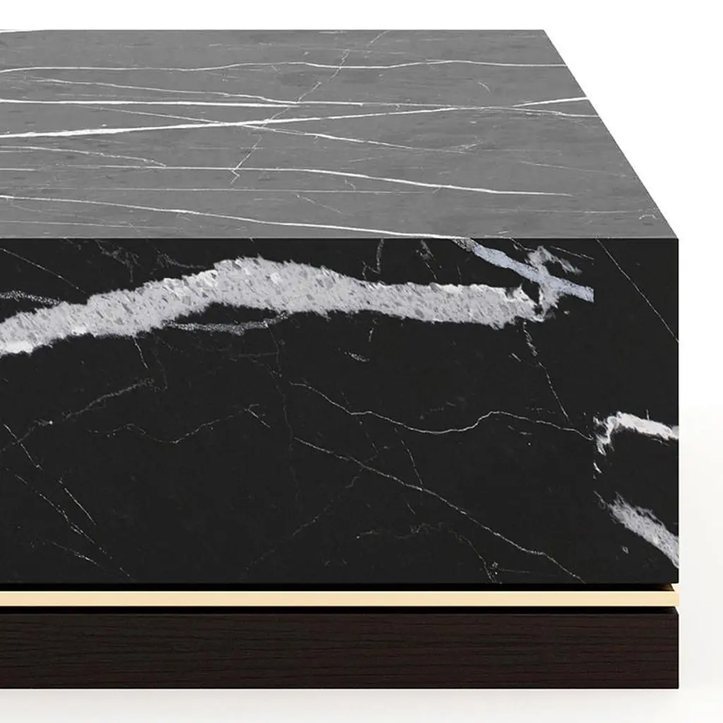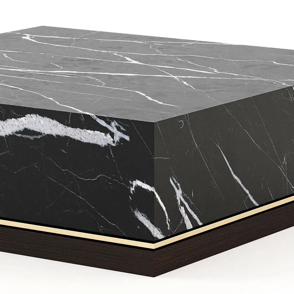 Coffee table Adamo with wooden structure andwith marble plates in black marble. With oak basein smocked oak matte finish and with polishedstainless steel trim in gold finish.Also available on request with other stainless steeland marble finishes.