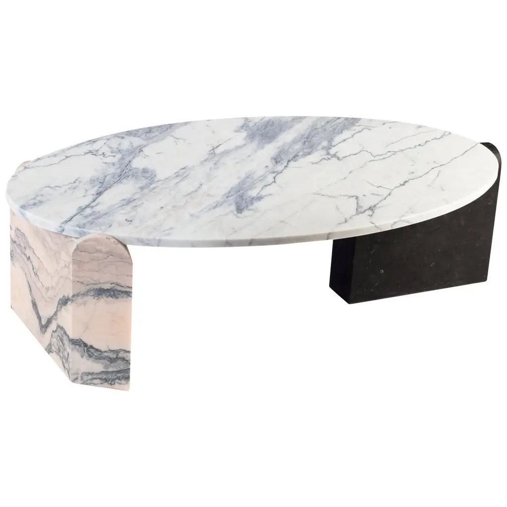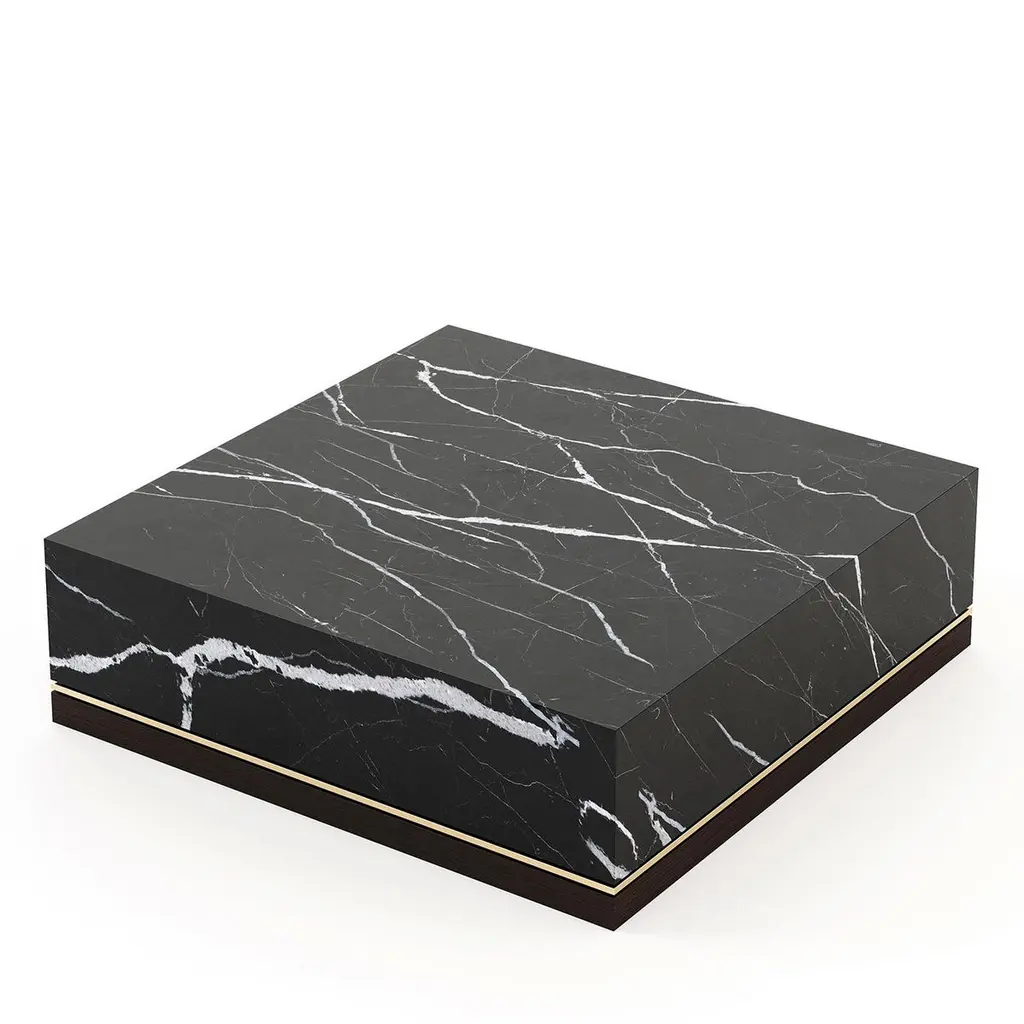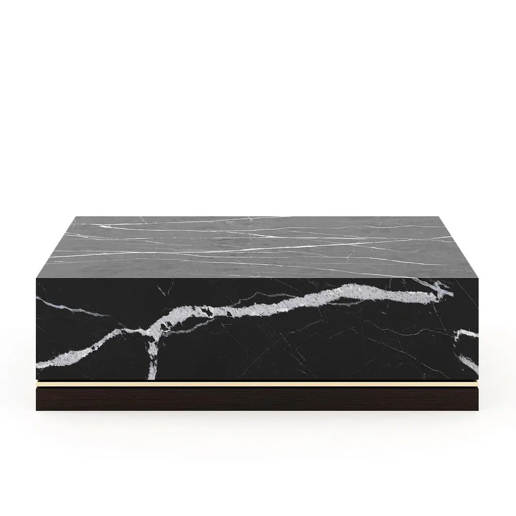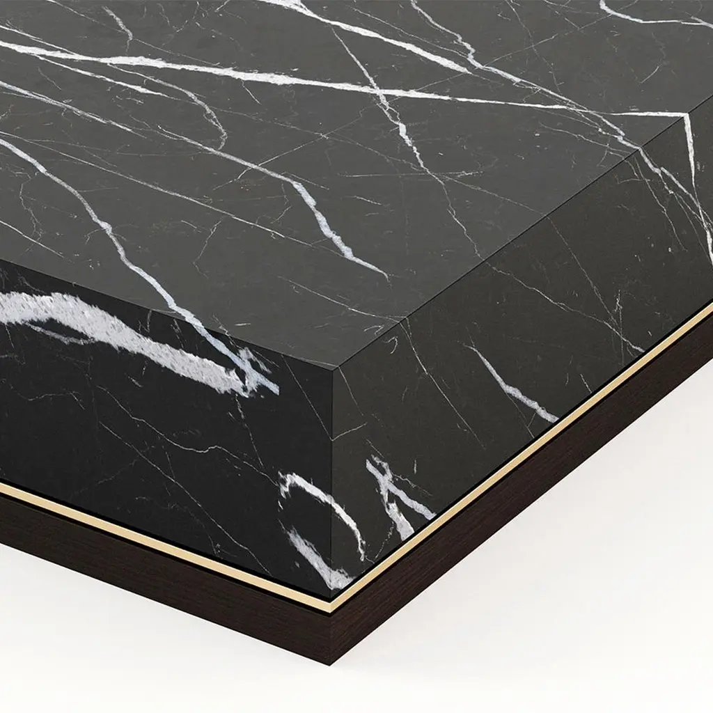 Coffee table Adamo with wooden structure andwith marble plates in black marble. With oak basein smocked oak matte finish and with polishedstainless steel trim in gold finish.Also available on request with other stainless steeland marble finishes.