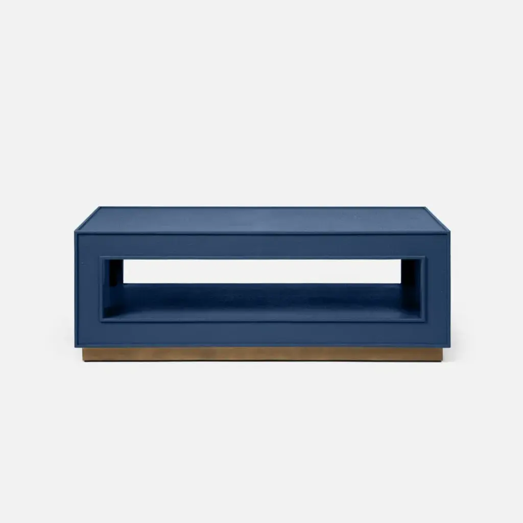 Faux ostrich softens a square silhouette while edge molding, which emphasizes open sides and straight lines, provides a subtle lip around the edges. Supported by painted distressed gold feet.