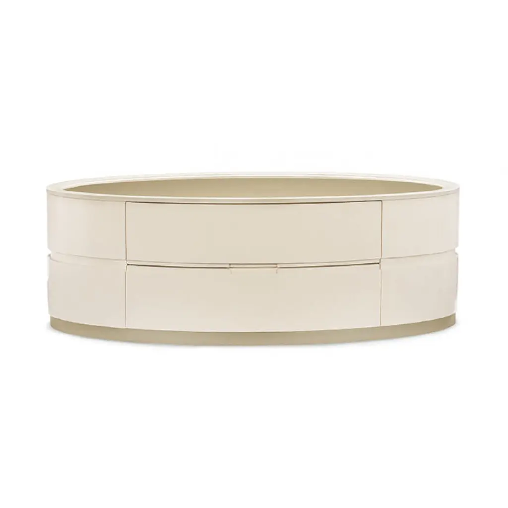 The Adela Oval Cocktail Table has modern neoclassic features and is beautifully detailed with a beveled glass top that reflects shimmering Blush Taupe paint underneath. The piece has two drawers; the top drawer’s interior has Blush Taupe metallic stencil details. This is a sleek piece that will stand out in front of a generously sized sofa.
