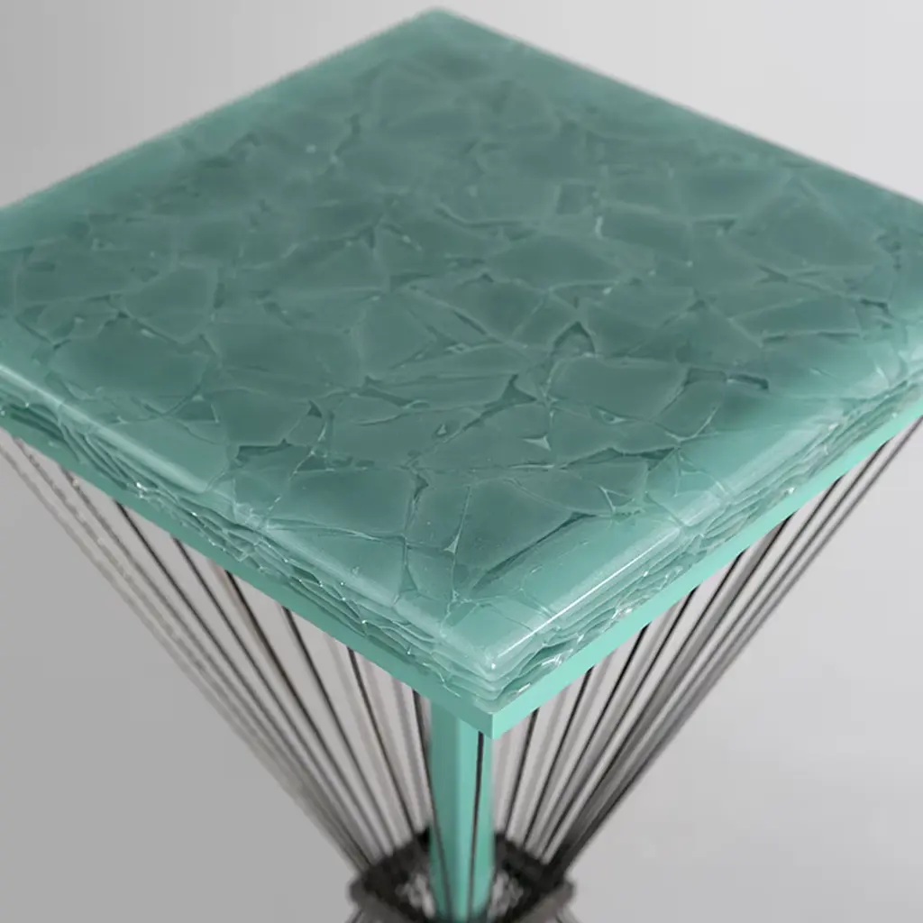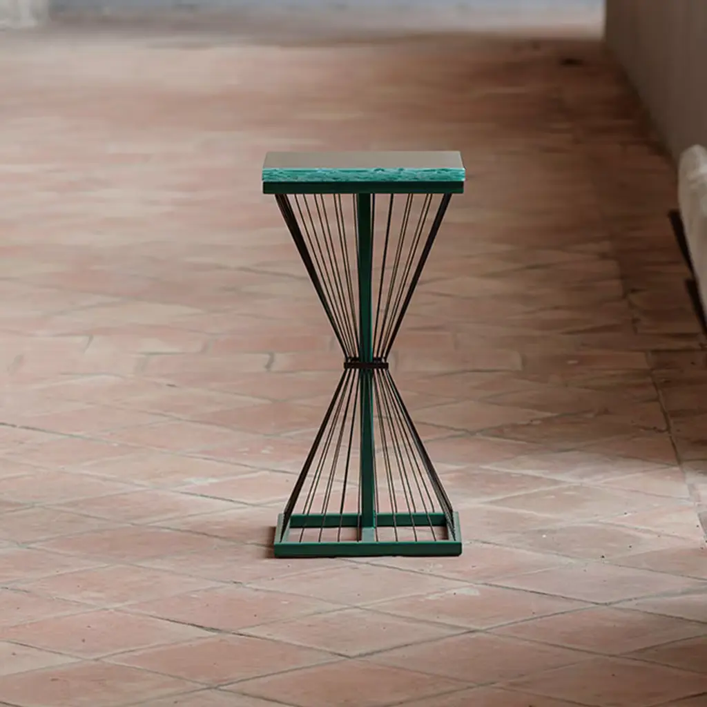 Combining different materials in a harmonious aesthetic balance, this cocktail table will grace any seating arrangement in a mid-century-modern living room with its glamourous style. The recycled glass top complements the seafoam-green-painted metal structure, where thin strands of black nickel-galvanized stainless steel are sewn directly onto the square base and top. Held together in the center, the strands create an hourglass shape that is the leitmotif of the Aegis Collection inspired by Zeus mythological breastplate thought to possess supernatural powers.