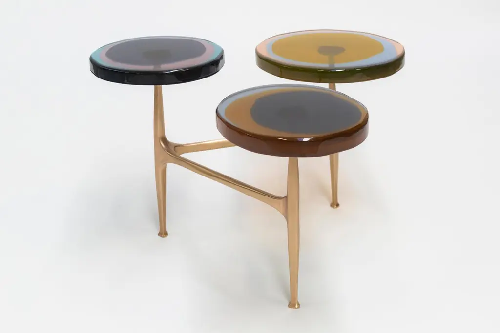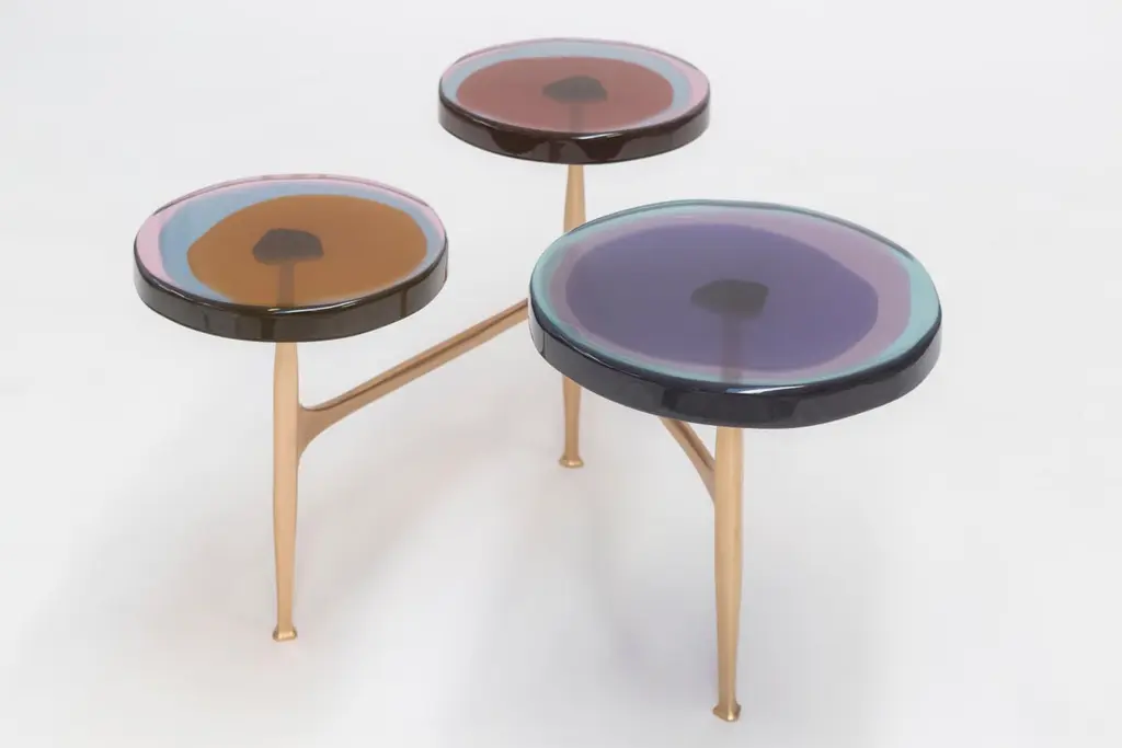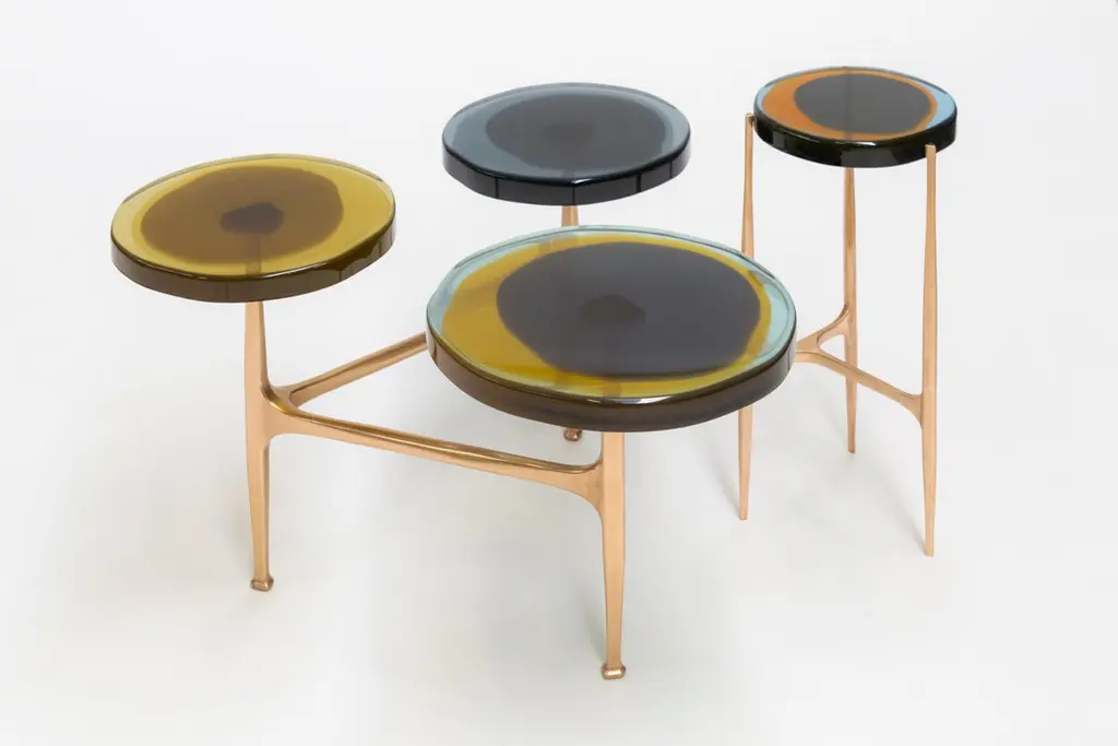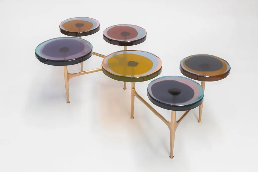 Clusters of wildflowers inspired the multi-top Agatha coffee table series with its organic shapes and iridescent tints. The irregular circular tops in transparent epoxy resin are embedded in a matte-effect bronze frame. Entirely hand-cast in several layers by our artisans, the vibrant colors create deed, fluid compounds.SIZE: L 80, W 80, H 50 Top Ø 32/40 cmThe price is for 5 tops in Ø32cm. Surcharge of € 200 for any top in Ø40cmDraga&Aurel resin colors are absolutely unique as they are handmade using a combination of different shades.