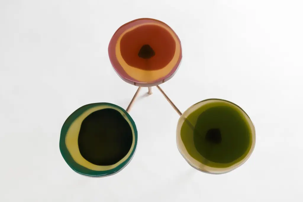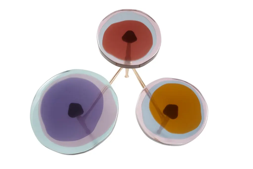 Clusters of wildflowers inspired the multi-top Agatha coffee table series with its organic shapes and iridescent tints. The irregular circular tops in transparent epoxy resin are embedded in a matte-effect bronze frame. Entirely hand-cast in several layers by our artisans, the vibrant colors create deed, fluid compounds.SIZE: L 80, W 80, H 50 Top Ø 32/40 cmThe price is for 5 tops in Ø32cm. Surcharge of € 200 for any top in Ø40cmDraga&Aurel resin colors are absolutely unique as they are handmade using a combination of different shades.