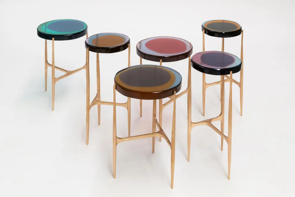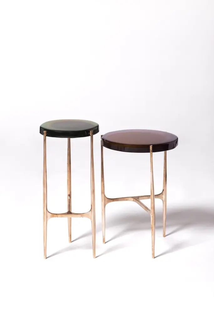 Agatha coffee table by Draga & Aurel.Dimensions: W 24 x D 24 x H 56.top Ø 34 cm.Materials: Resin, bronze.The Agatha coffee tables are featured by irregular circular tops of transparent andcolorful resin sit on a bronze frame with a staggered placement, inspired by clustersof wildflowers.The table tops’ process of creating requires a special technique of casting resinentirely made by hand in the Draga & Aurel laboratory of Como. Playing with vibrantcolor combinations, also incorporating any random mistakes and accidents, thematerial is melted into several layers creating fluid, deep, unique table tops. Thestructure in bronze is made by casting. Thanks to a handcrafted, artistic process thecoffee tables are featured by a special matte effect in earth-colored.Founded in 2007 in the town of Como, Italy, Draga & Aurel is a multidisciplinary design studio that works along the spectrum of furniture, textile and interior design. Draga Obradovic began her career in the fashion industry, first working in London and Milan as a textile designer before eventuallysettling in Como. Aurel K. Basedow graduated from Milan’s Accademia di Belle Arti with a degree in Fine Arts, having previously trained as a carpenter and woodworker. Thanks to their sympathetic methods, combined with an artist’s approach to material and composition Draga & Aurel are widelyrecognized for their clever reinvention of bespoke vintage design pieces.Their showing at 2009 Salone del Mobile introduced the duo to the world stage; it followed the partnerships with several companies that have pushed the pair’s domain beyond the reinvention of singular vintage pieces. While interior projects have expanded their sought after aesthetic into the realm of hospitality and lifestyle. In occasion of the 2019 Milan Design Week the design duo presented Transparency Matters, an exhibition of limited edition pieces, entirely fabricated by hand in their Como atelier.