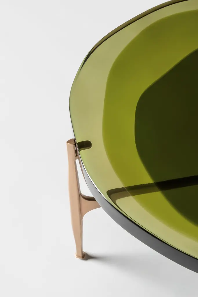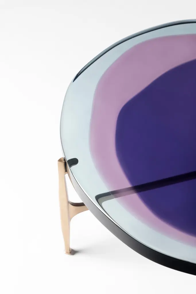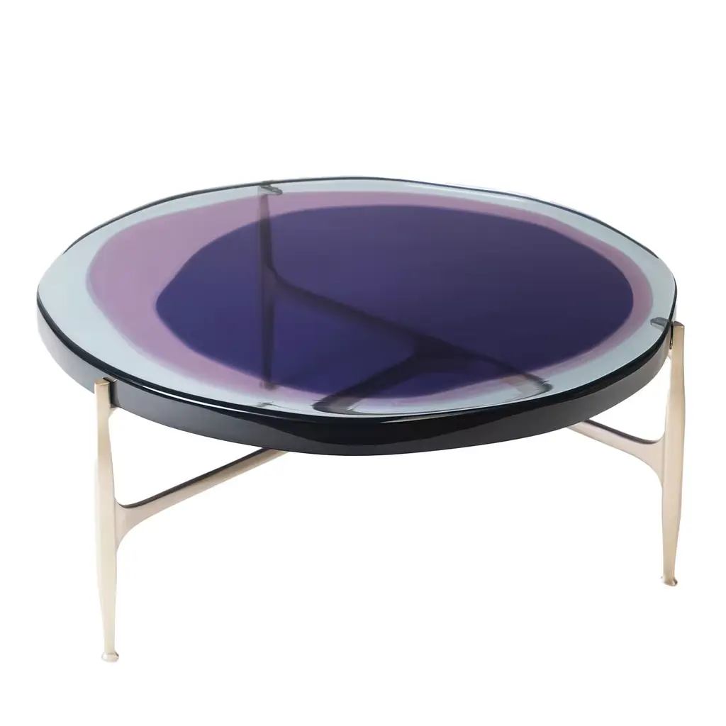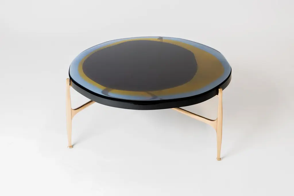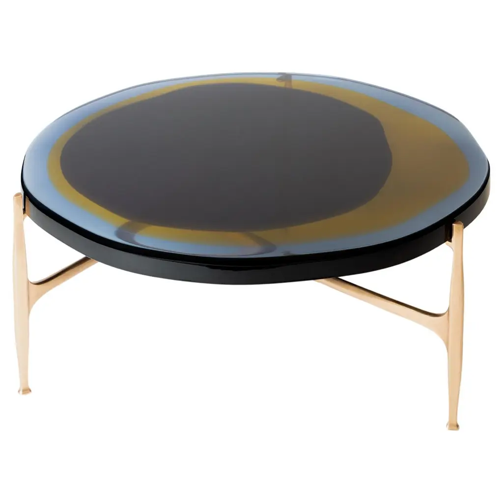 Agatha coffee table series is enlivened by an irregular circular top in transparent epoxy resin that holds a dialogue with light. The vibrant colors are poured in several layers to create a deep and fluid compound, embedded in a matte-effect bronze frame. Suitable to stand alone in the living area, Agatha big top coffee table is entirely handcrafted in our atelier.SIZE: L 90, H 36 Top: Ø 90 cmDraga&Aurel resin colors are absolutely unique as they are handmade using a combination of different shades.