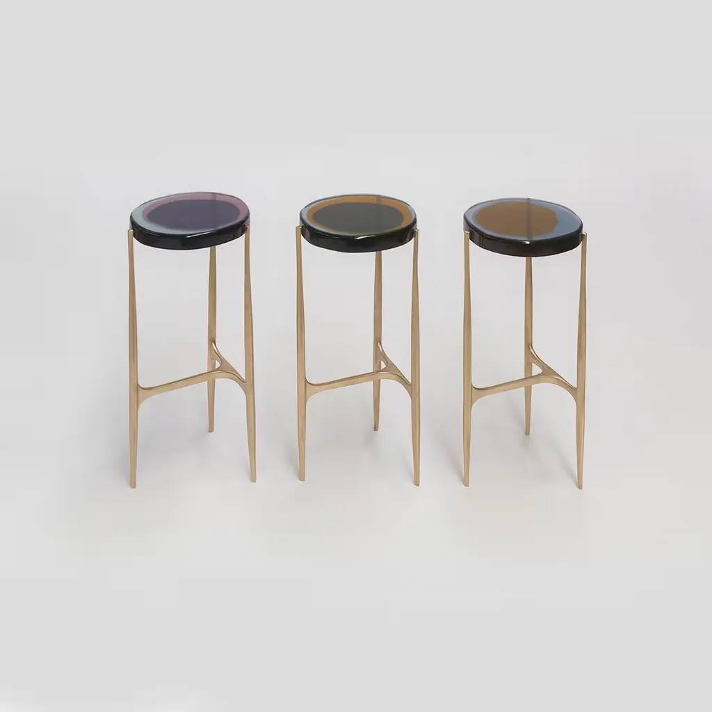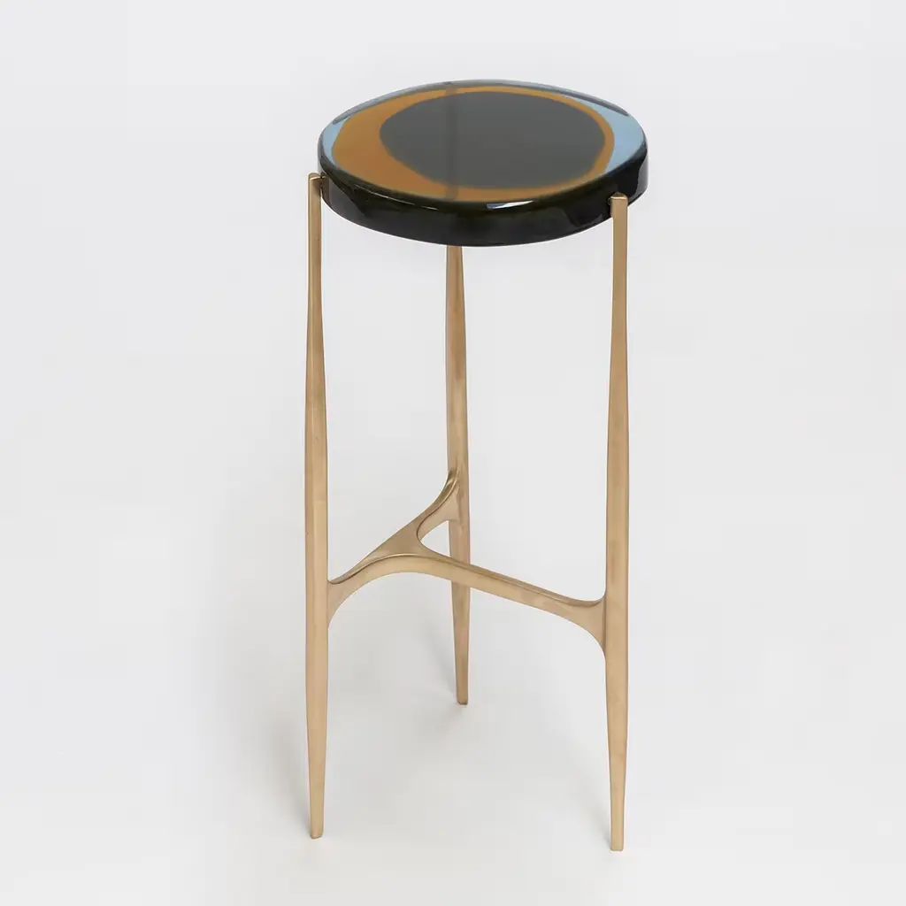 Agatha coffee table series is enlivened by an irregular circular top in transparent epoxy resin that holds a dialogue with light. The vibrant colors are poured in several layers to create a deep and fluid compound, embedded in a matte-effect bronze frame. Carefully handcrafted in our atelier, Agatha coffee tables are available in two sizes, lending themselves to multiple compositions. Available in different colors.