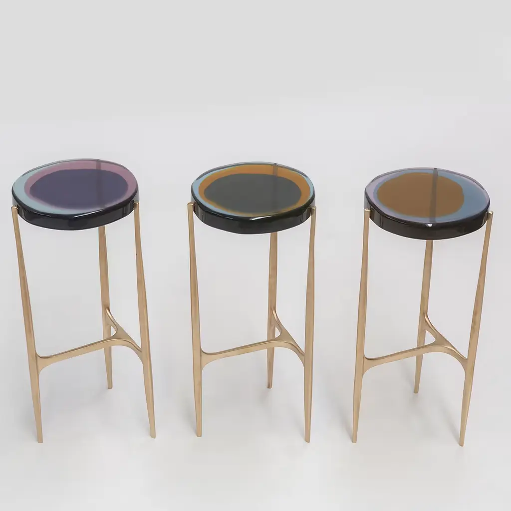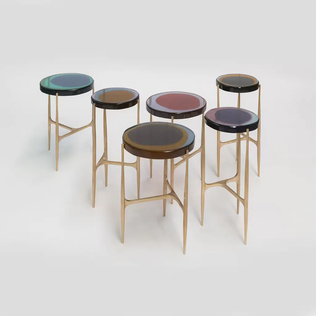 Agatha coffee table series is enlivened by an irregular circular top in transparent epoxy resin that holds a dialogue with light. The vibrant colors are poured in several layers to create a deep and fluid compound, embedded in a matte-effect bronze frame. Carefully handcrafted in our atelier, Agatha coffee tables are available in two sizes, lending themselves to multiple compositions. Available in different colors.