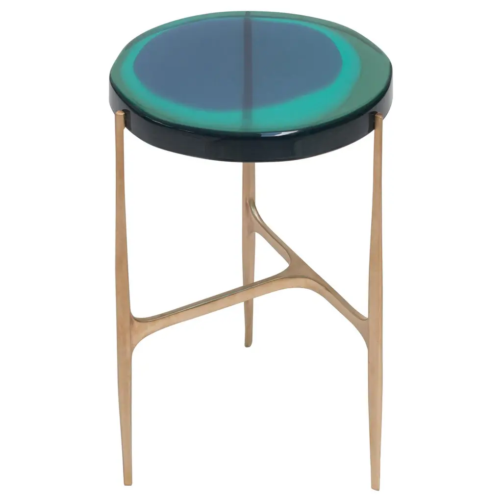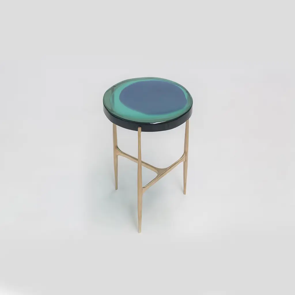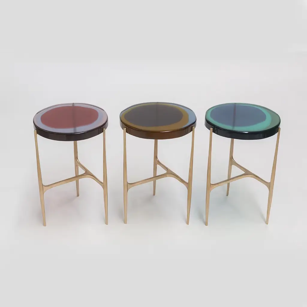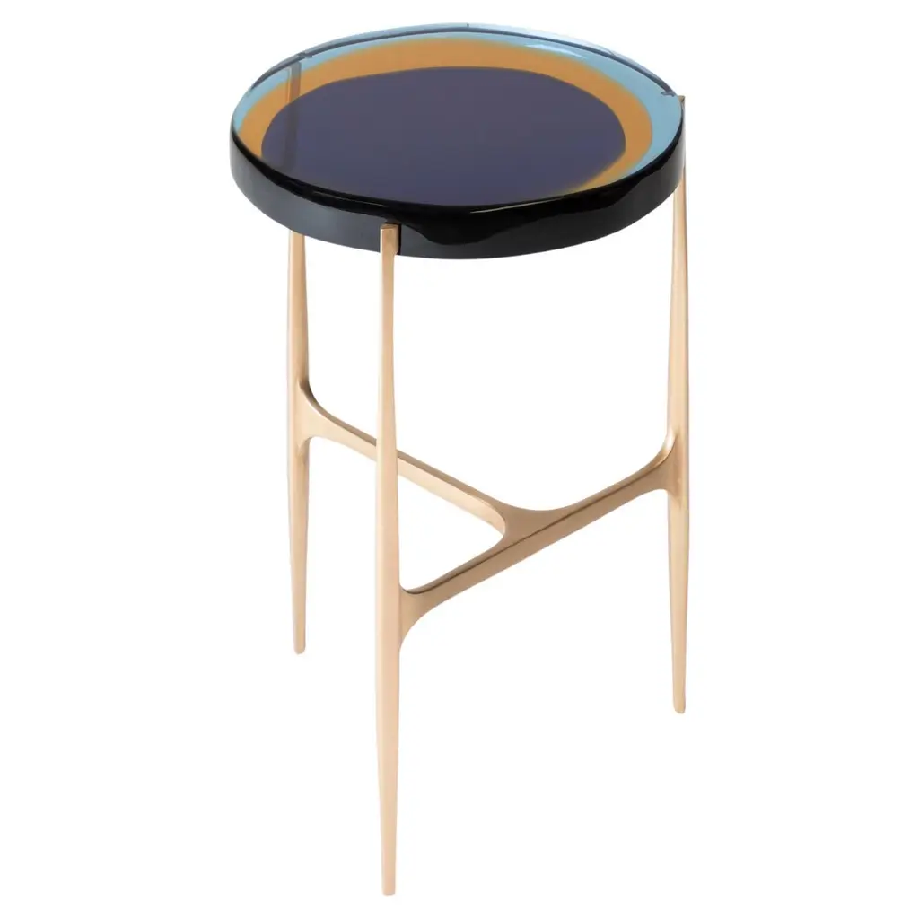 Agatha coffee table series is enlivened by an irregular circular top in transparent epoxy resin that holds a dialogue with light. The vibrant colors are poured in several layers to create a deep and fluid compound, embedded in a matte-effect bronze frame. Carefully handcrafted in our atelier, Agatha coffee tables are available in two sizes, lending themselves to multiple compositions. Available in different colors.