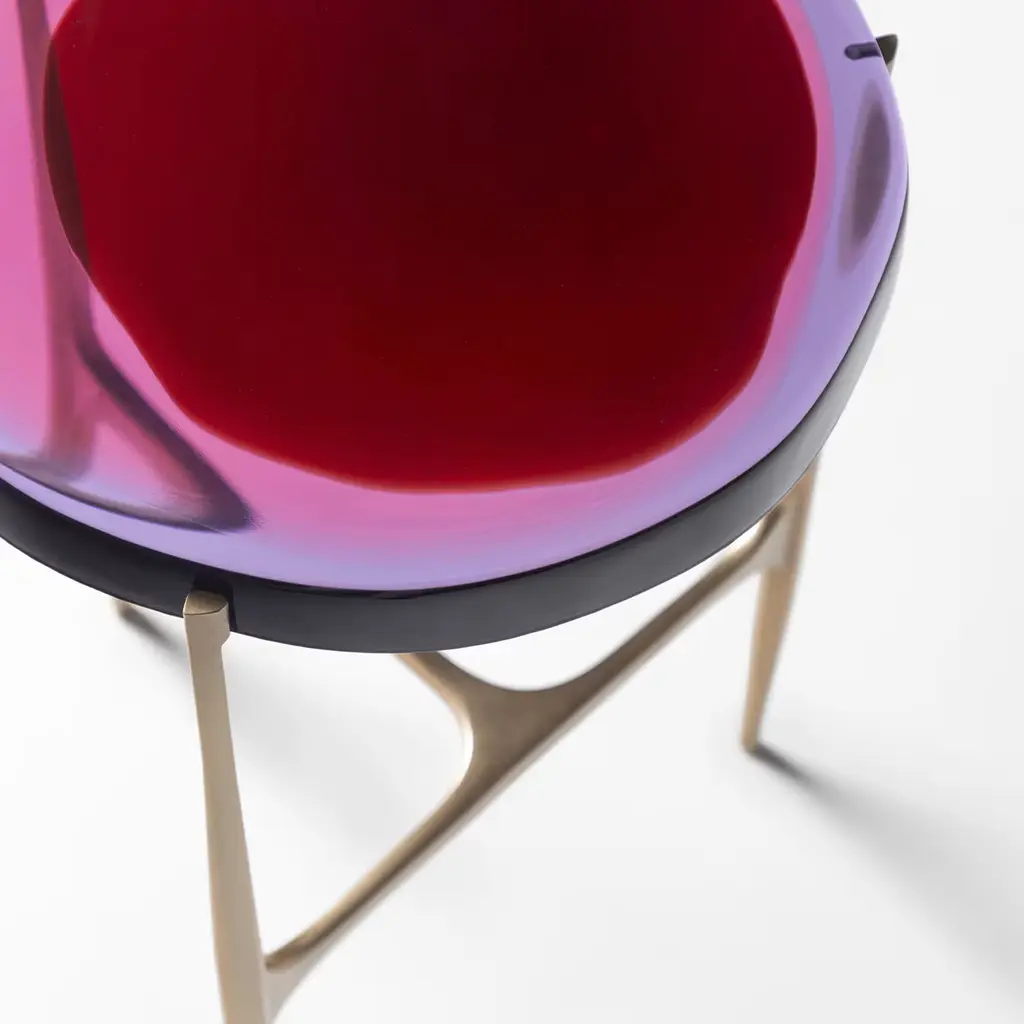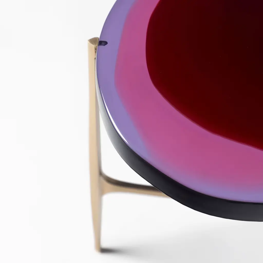 Agatha coffee table series is enlivened by an irregular circular top in transparent epoxy resin that holds a dialogue with light. The vibrant colors are poured in several layers to create a deep and fluid compound, embedded in a matte-effect bronze frame. Carefully handcrafted in our atelier, Agatha coffee tables are available in two sizes, lending themselves to multiple compositions. Available in different colors.