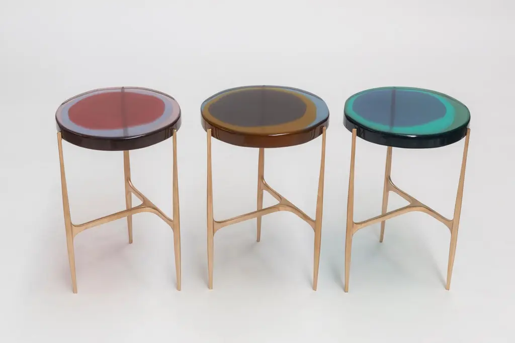Agatha coffee table series is enlivened by an irregular circular top in transparent epoxyresin that holds a dialogue with light. The vibrant colors are poured in several layersto create a deep and fluid compound, embedded in a matte-effect bronze frame.Carefully handcrafted in our atelier, Agatha coffee tables are available in two sizes,lending themselves to multiple compositions.SIZE: Ø 34 - H 50 cmDraga&Aurel resin colors are absolutely unique as they are handmade using a combination of different shades.