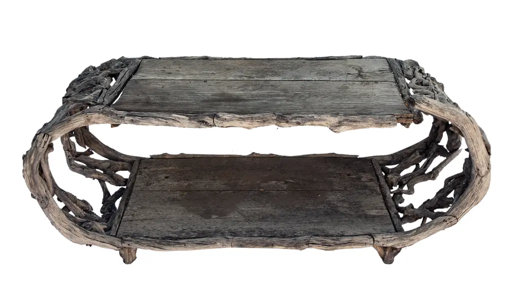 Asian driftwood coffee table. This table has 2 chairs, by the same atist which as both listed separately.This piece has been in both indoor and outdoor locations, the graying is a natural process.