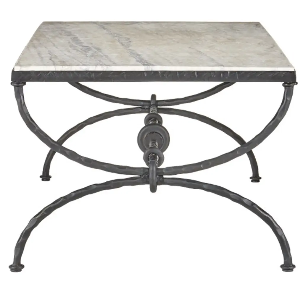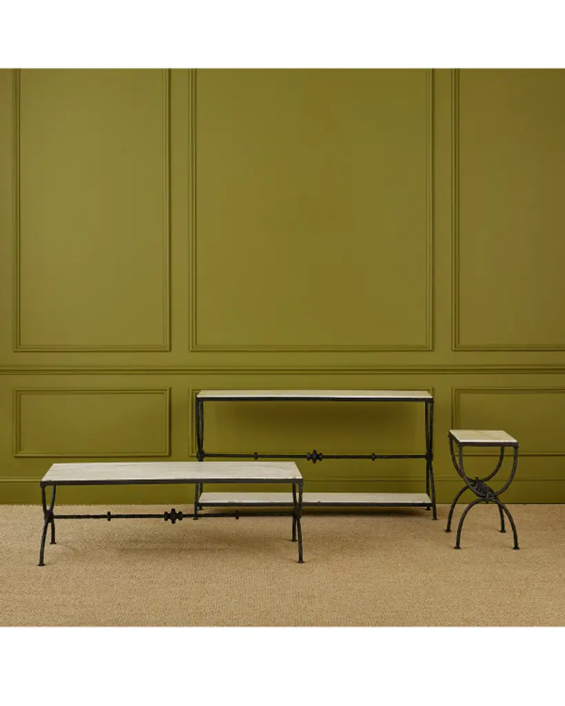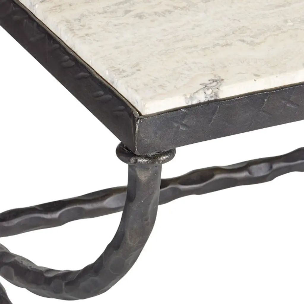 The Agora Travertine Cocktail Table blends classical Greek-inspired design with modern sophistication. Its travertine top features dynamic veining that adds natural depth and texture. The looping hourglass-shaped legs, connected by a stretcher adorned with decorative orb detailing, create a striking sculptural silhouette. The metal frame provides a warm contrast to the light stone.