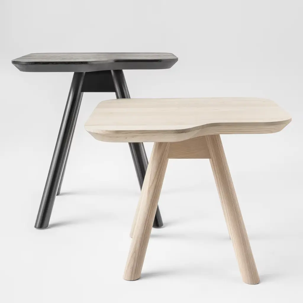 Boasting an essential shaped top in solid ash wood resting on a minimalist, likewise-fashioned tripod comprised of three slanted legs, this stupendous side table is a clean and sophisticated design by Emilio Nanni. It will be a stand-out addition displayed in both private and commercial interiors of contemporary inspiration.