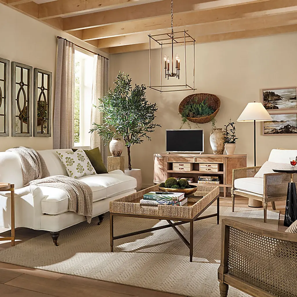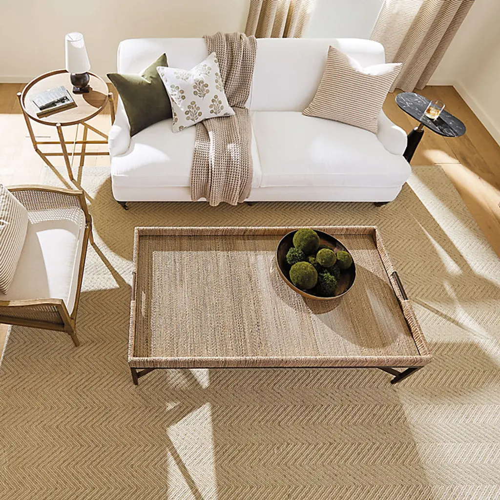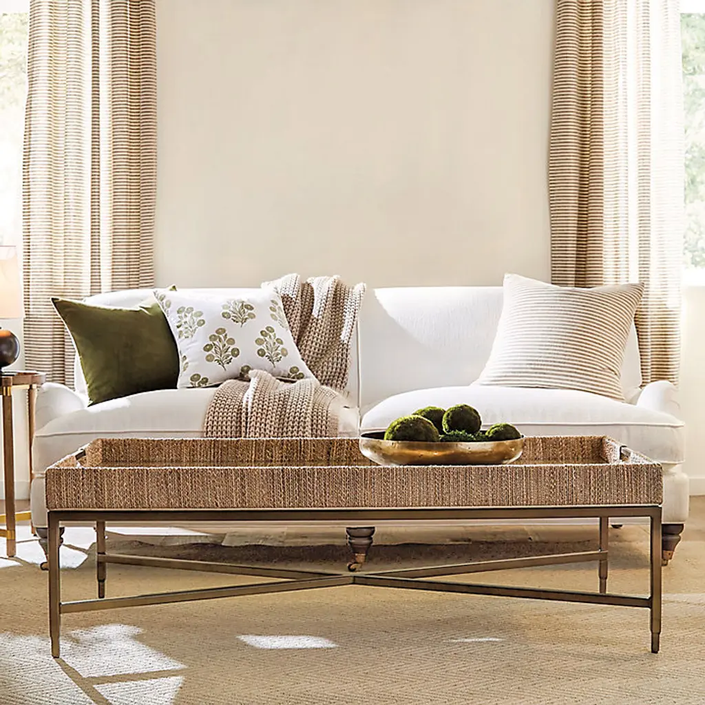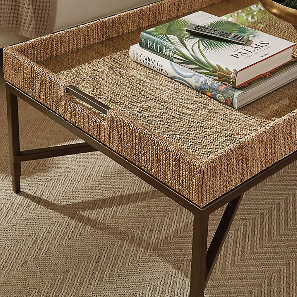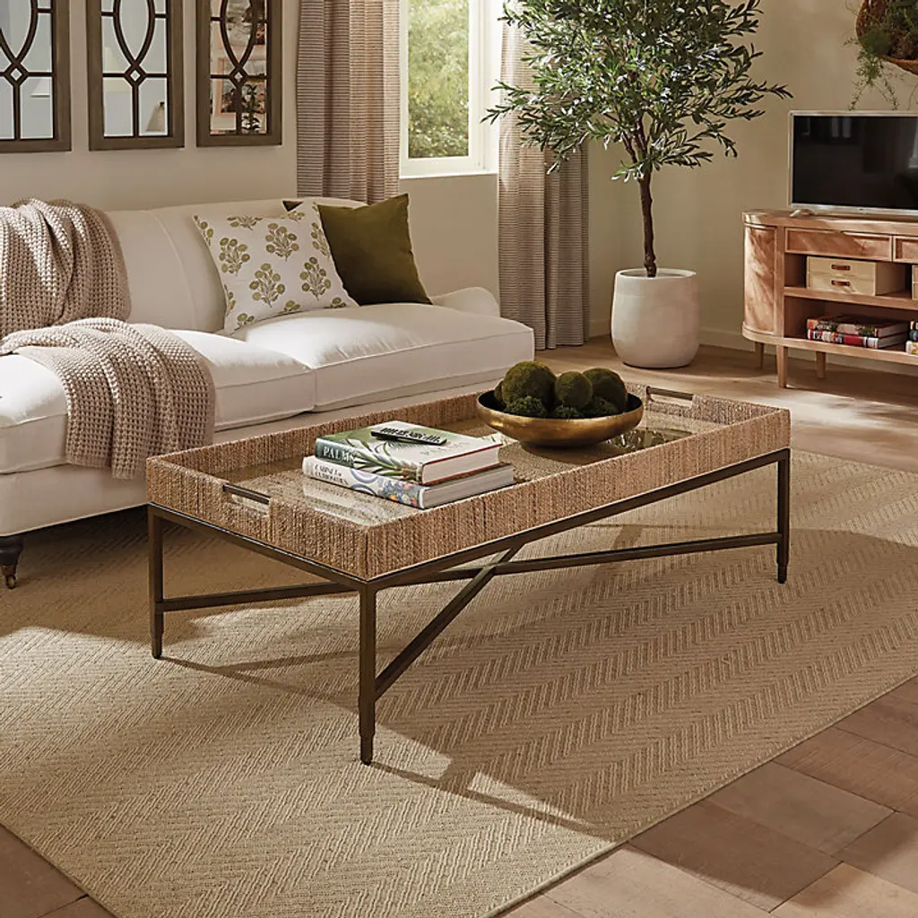For big family room sectionals and living room sofas, you need lots of beautiful serving space. Almost five feet in length and extra deep, our Alaya Woven Coffee Table is designed to handle a crowd with casual, contemporary style. The fixed tray top is hand woven of twisted natural abaca over a clean-lined, antique brass metal frame. The distinctive "X" stretcher and in-stepped feet add refined notes. Handle details complete the faux tray look. A clear, tempered glass insert protects your tabletop from spills and makes clean-up easy. Alaya Woven Coffee Table features: