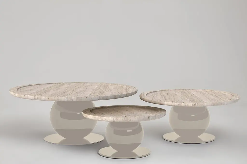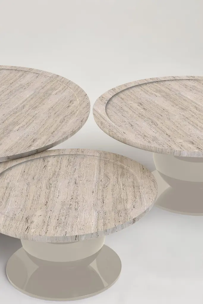 Alba Coffee Table by Le Berre VevaudDimensions: D 98 x H 39 cm.Materials: Top in Osso travertine; feet in New Ivory RAL 9001 lacquer.For over 15 years, Raphaël Le Berre and Thomas Vevaud have been writing beautiful pages of interior architecture together. With precision and acuity, they deploy a singular decorative vocabulary, in the manner of the great French ensembliers whose attraction to exceptional craftsmanship, authentic materials and meticulous color schemes they share. From Parisian mansions to London penthouses and Mediterranean resorts, interior designers have a vast field of expression. They love this spirit of cosmopolitanism, which sharpens their curiosity and strengthens their ability to adapt. The duo questions its style according to the lifestyle of its customers, the type of location and the natural environment. Raphaël Le Berre and Thomas Vevaud assert their taste for a certain eclecticism. While the timeless sophistication of Art Deco, the avant-garde spirit of the Bauhaus and the poetry of the Memphis movement continue to guide them, they follow in the footsteps of artist Ado Chale, famous for his experiments with metals and other composite materials, and architect Charles Deacon, creator of singular houses with elliptical curves. Jacques Couëlle’s architectural creations, at the crossroads of mystery and utopia, are also a powerful source of inspiration. Traffic flow, light distribution, functionality and privacy are all imperatives and necessities that are taken seriously, on a par with aesthetic expression.