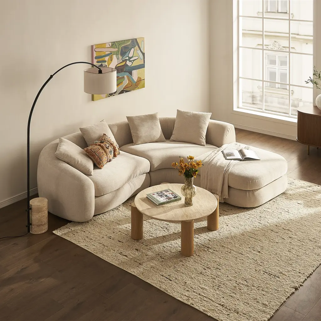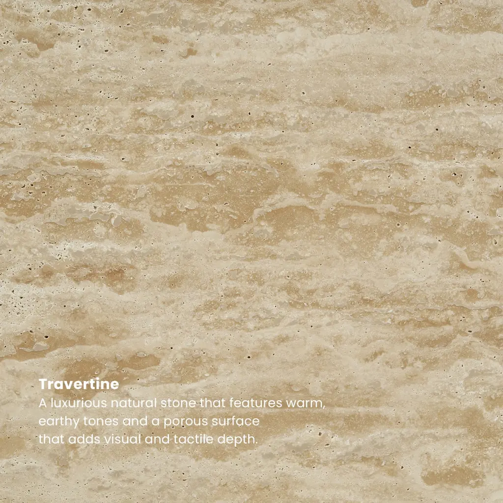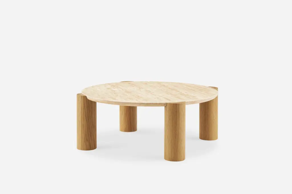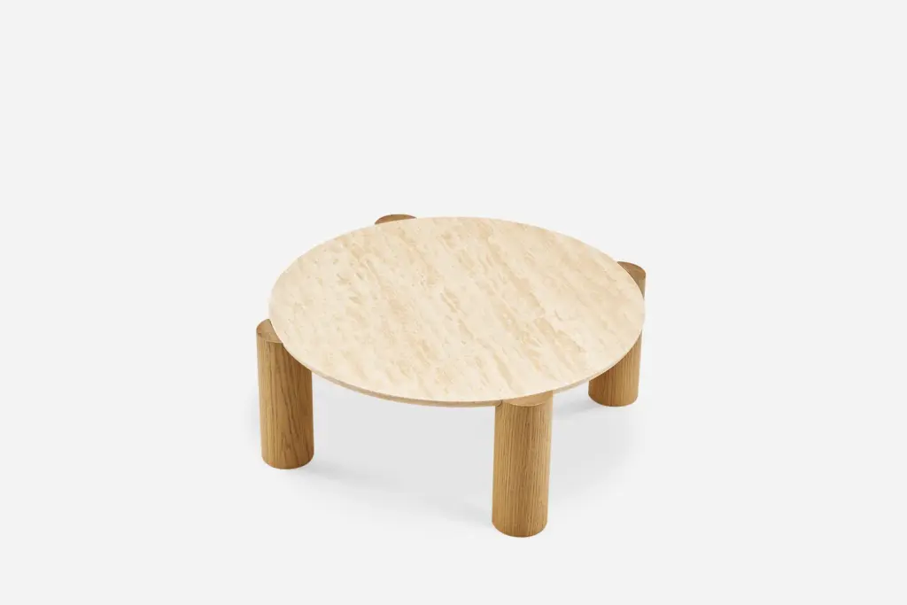 An ode to natural beauty with its textured surface and earthy tones, Albie's travertine tabletop perches on cylindrical wooden legs.