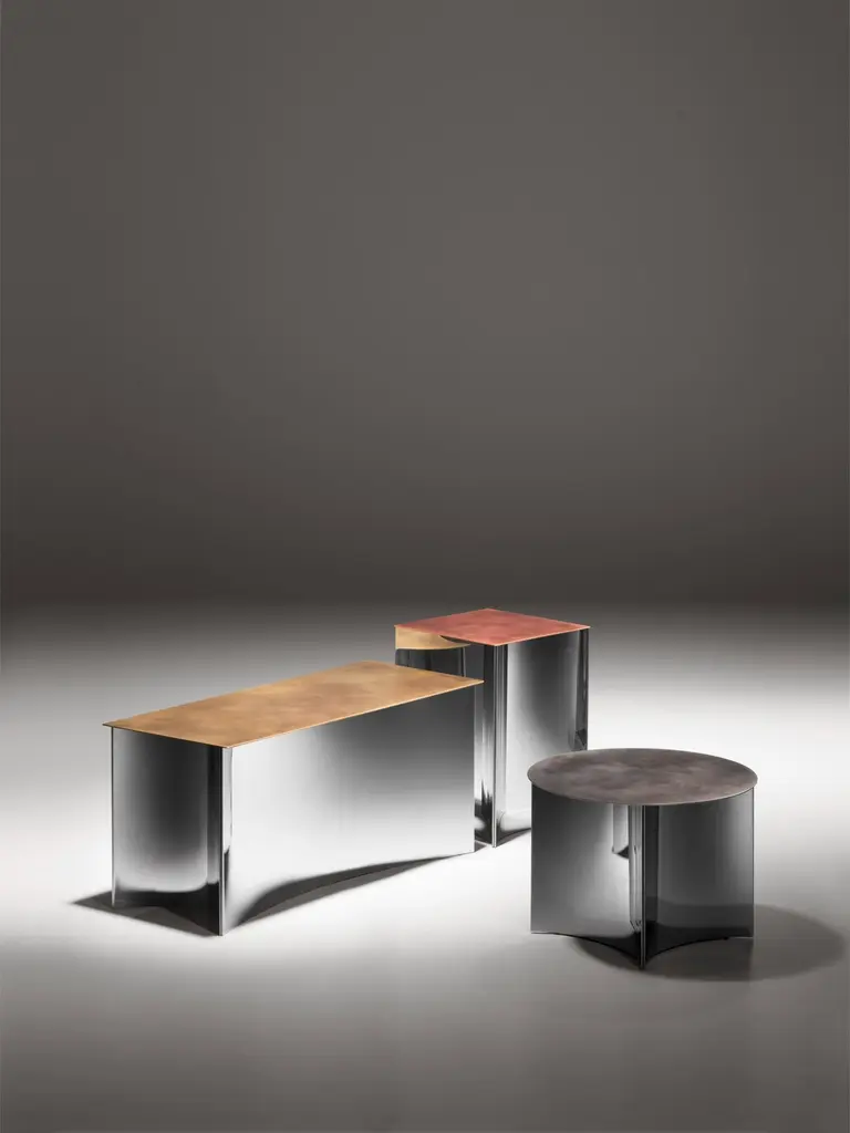 Alchemy 50 Coffee Table by De CastelliDimensions: W 35 x D 35 x H 50 cmMaterials: DeLabré Copper, Polished Stainless SteelOther versions are available, please contact us for any request.Alchemy is an ancient art whose main goal was to convert humble metals to precious ones, using an esoteric language to give materials a metaphysical quality. The Alchemy collection was inspired by this magic science, resulting in changeable compositions of tables that come together in immediate formal chemistry. Chromatic variations emphasise the expressivity of the materials and the concave shape of the bases refracts the luminosity of stainless steel, contrasting with the textural geometries of the copper, brass and DeLabré iron tops.DE CASTELLI“HARD COUTURE”Faithful to its decision to reinstate the special role of metal in design and experimentation, De Castelli infuses artisan ideas and workmanship into industrial processes, leading to entirely original results. The encounter with design inspires an approach to materials founded upon respect for their potential, be it hidden or obvious, which emerges slowly in a collection of pieces that, despite being part of a series, remain unique.Unique not only for the hand that has created them, but also for the singular cultural path that focuses on the aesthetic (and not just practical) value of the primordial material with which De Castelli shapes living spaces.A BESPOKE APPROACHEach object, even in the repetition of form, is a creative act in and of itself, one that incorporates a heritage of constantly-evolving expertise and research. The equation that relegates ‘cold’ metals to the margins of furnishing projects is thus overturned, bringing iron, brass and copper, in their infinite variations and finishes, to the centre of an entirely renewed stage, allowing them to finally shine with their own light.SUSTAINABILITYDe Castelli has always been committed to making the entire production cycle increasingly sustainable, aware that metal, the material with which its business identifies itself, is precious and must be treated with care, without waste.PEOPLE FIRSTThe wide spaces of the De Castelli headquarters in Crocetta del Montello (TV) allow those who work to enjoy environments where order, cleanliness and safety are always maintained and guaranteed. An attitude of attention and respect for people that has led to the shared ethical code.