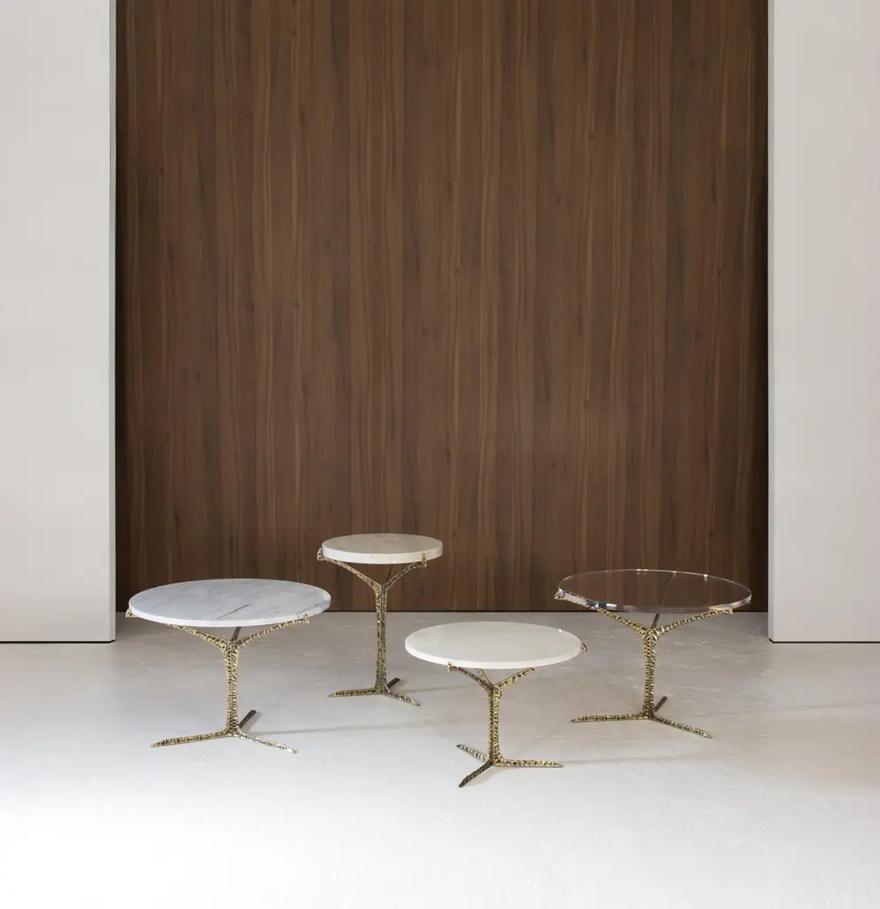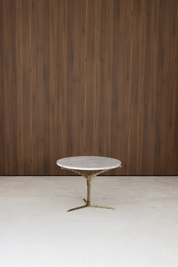 Alentejo coffee tables are a glimpse over the South of Portugal where thousands of cork oaks trees raise their canopies to the sky.Resembling the typical trees that spread across the horizon with their canopies gracefully balanced above the ground, this nature inspired design is based in the beautiful natural forms. The structure in cast brass with patinated effect results of a careful sculpted work that highlights the natural details.Product details:Top: Carrara marble.Base: Feet in cast brass with patinated effect finished in matt varnish.Product options:Top: other marbles, wood veneers, acrylic or lacquered in any Ral Classic color finished in matt, half gloss or high gloss varnish.Base: Feet in cast brass covered by copper or nickel bath with patinated effect finished in matt, half or high gloss varnish.Weight: 25Kg 55,2 lbsMade to order. Custom sizes and other finishes are available under request.Designed by Joana Santos Barbosa for InsidherLand, 2019. Handmade in Portugal.