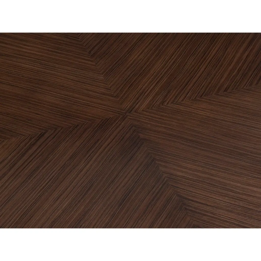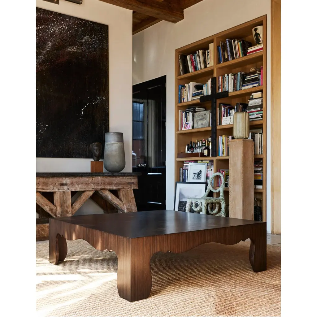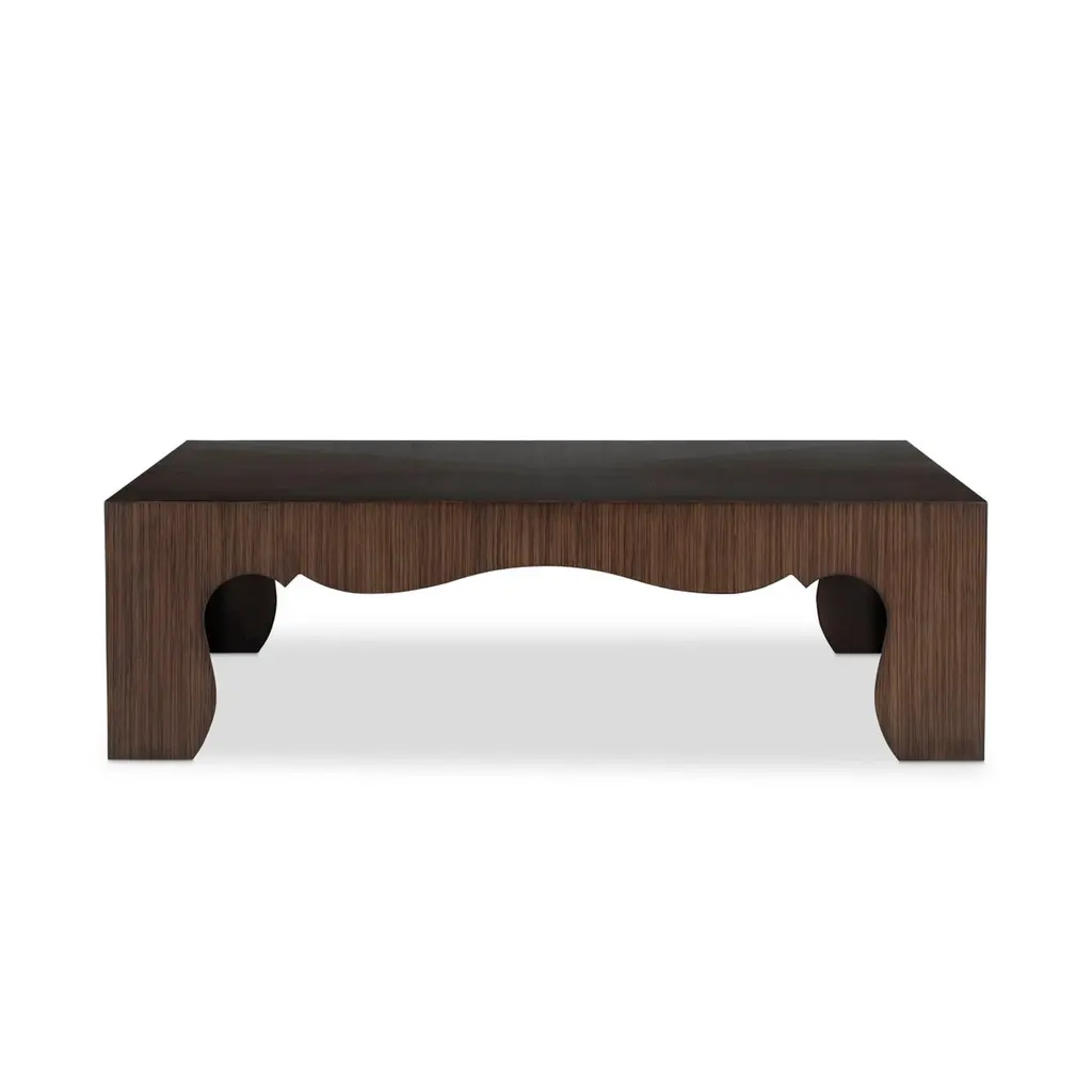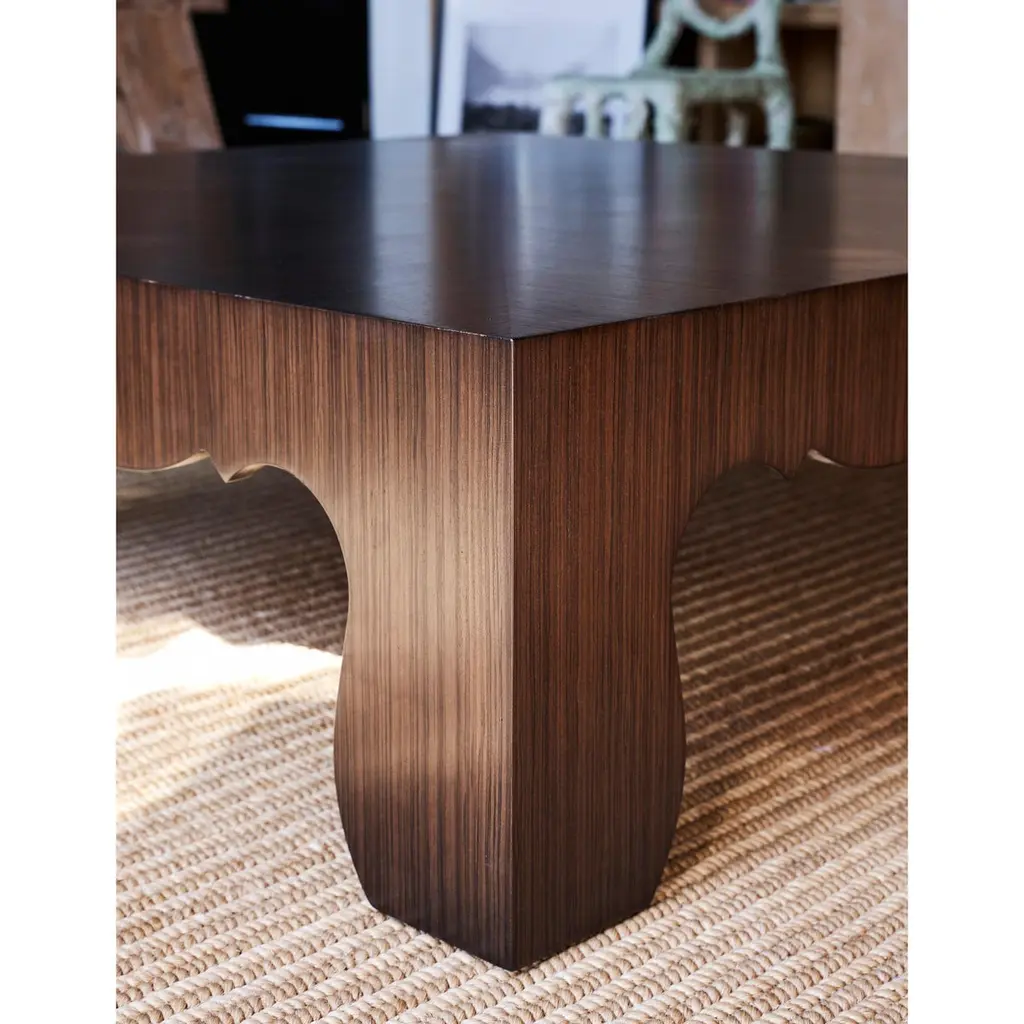 A nineteen forties inspired, elegant square or rectangular coffee table. Linear matched zebrawood veneer radiates from the center of the table and waterfalls over the dramatically scalloped aprons.Zebrano veneer grain has a ribbon figure, the texture is typically medium to coarse, and the wood is lustrous.- Shown in Avena Finish- Available in all Alfredo Paredes Case Finishes