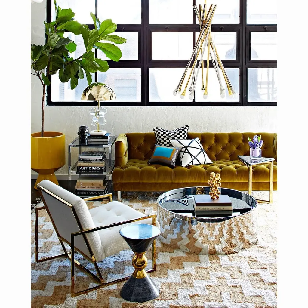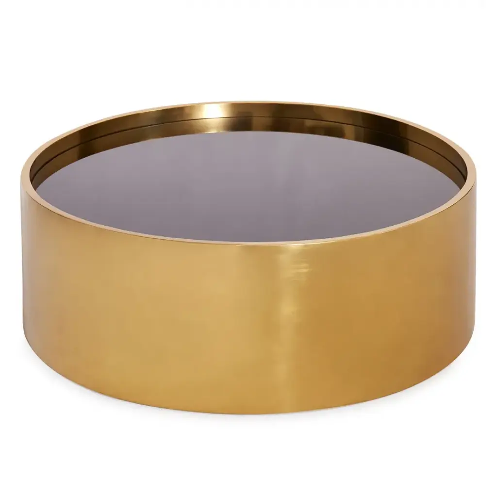 Futuristic reflection. Minimalist and modern, our Alphaville cocktail table shines in honed brass with a black glass top. The simple drum form is a solid anchor for any room, while the reflective surface keeps the feeling light and glamorous. An ideal complement to leggy sofas and chairs. Modernize a Park Avenue penthouse or add traditional elegance to a Tribeca loft.