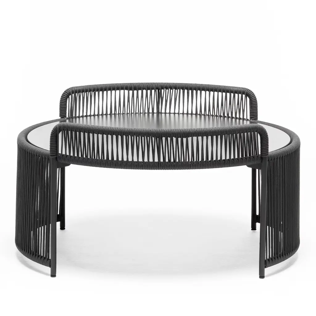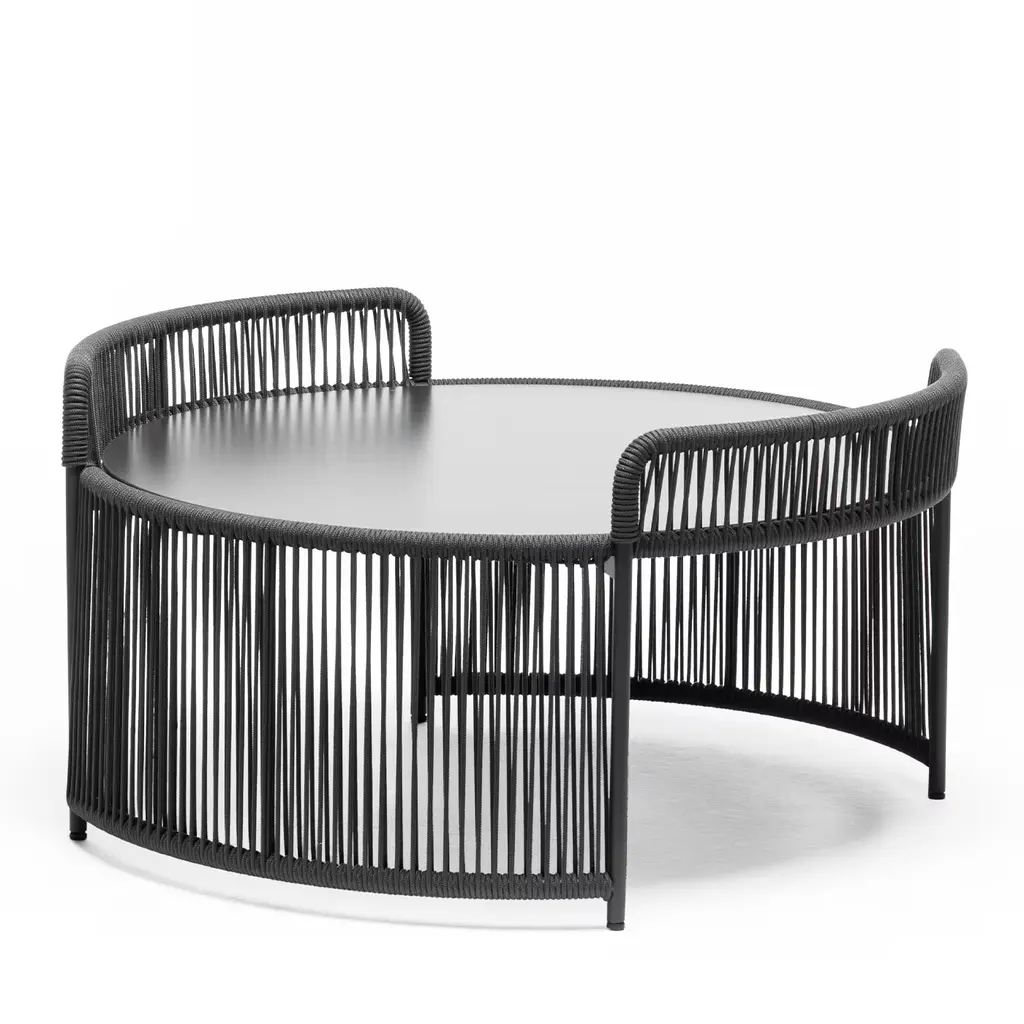 Excellent craftsmanship and evocative appeal merge in this elegant coffee table, conceived to accent modern outdoor contexts. The cylindrical steel frame powder-coated in anthracite gray gets wrapped in a color-matching marine rope, deftly combined in a dynamic pattern lending the piece a stimulating, airy look. Completed by a round HPL top flanked by curved elements. Please consult the Artemest catalog for other sizes and colors.