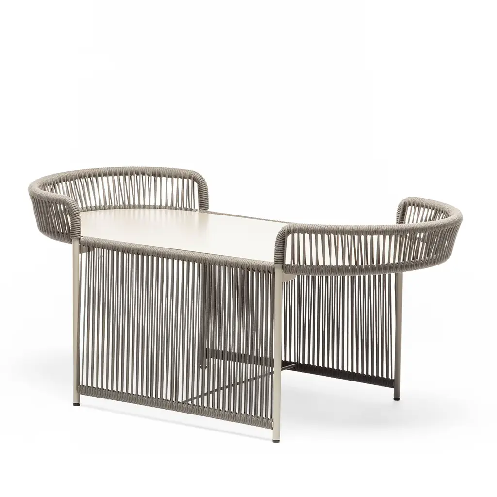 A thoughtful symmetry paired with an original distribution of volumes makes this coffee table elegant and sleek, perfect for gathering glasses for special toasts on a terrace or patio. Its distinguishing trait is the light-taupe-hued marine rope deftly wrapped around the steel structure powder-coated in a delicate sand shade, resulting in dynamic traceries of intersecting lines. Please consult the Artemest catalog for other sizes and colors.