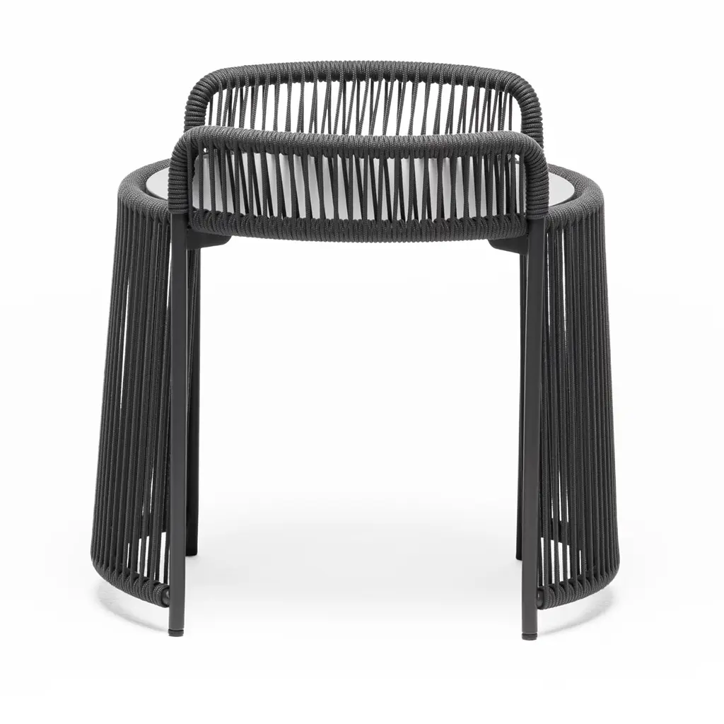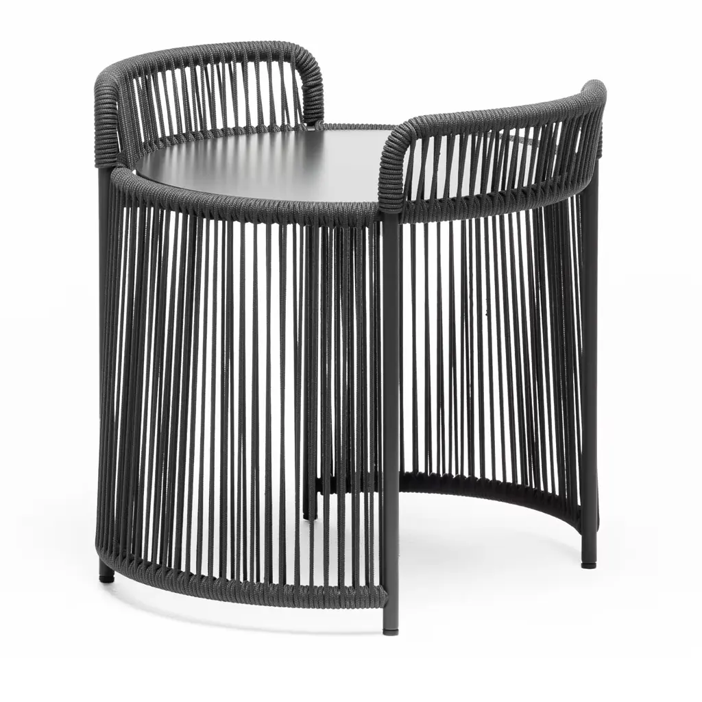 Designer Antonio De Marco artfully combined in this coffee table the suggestion of seaside atmospheres with the sleek elegance of modern design taste. The steel structure powder-coated in anthracite gray features curved elements flanking the round HPL top that are deftly wrapped in color-matching marine ropes, as well as the front elements of the base. Coming in multiple color options, it is apt for outdoor use.
