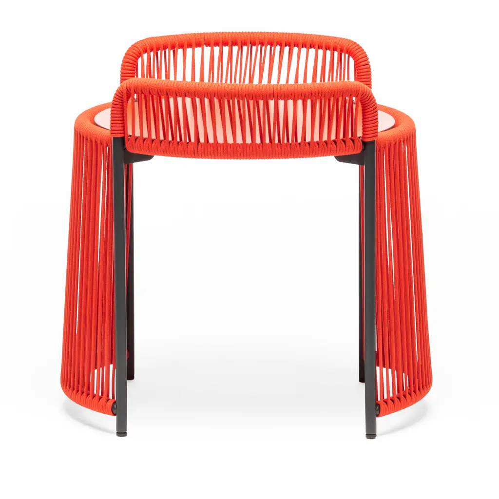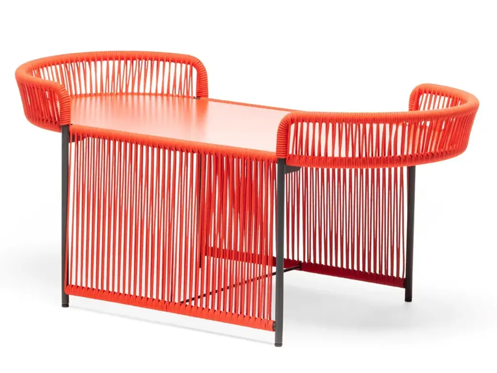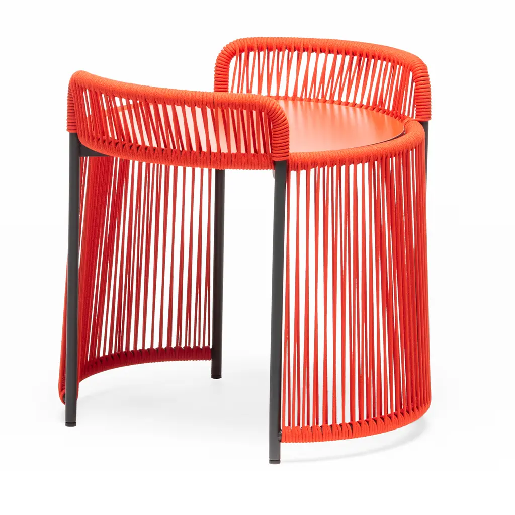 A showcase of craftsmanship, this compact coffee table for outdoor use stands out for its eclectic design, where thin, red-hued marine ropes are manually wrapped in intricate patterns around a sleek steel structure powder-coated in anthracite gray. The circular top in HPL is set in between two curved elements almost embracing the objects laying on top of it. Please consult the Artemest catalog for color variants.