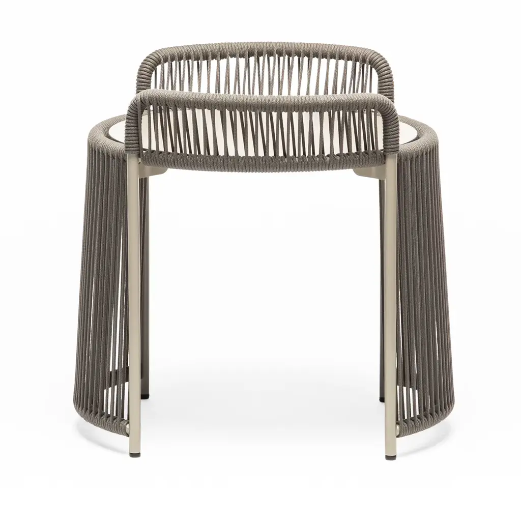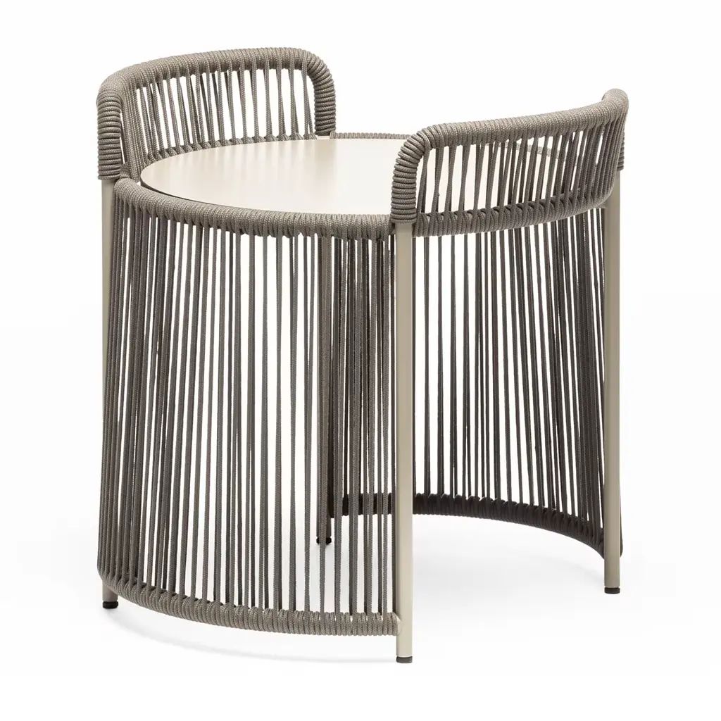 Quiet in its palette as it is eye-catching in its design, this compact coffee table provides an original solution to display a lantern or serve a cup of tea in sophisticated outdoor contexts. The sturdy steel structure powder-coated in sand is rich in harmonious curves, deftly wrapped in gray marine ropes able to evoke seaside scenes while creating intricate traceries of undoubted visual charm. Completed by an HPL round top. Please consult the Artemest catalog for other sizes and colors.