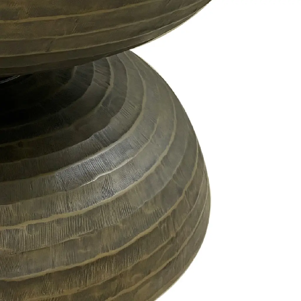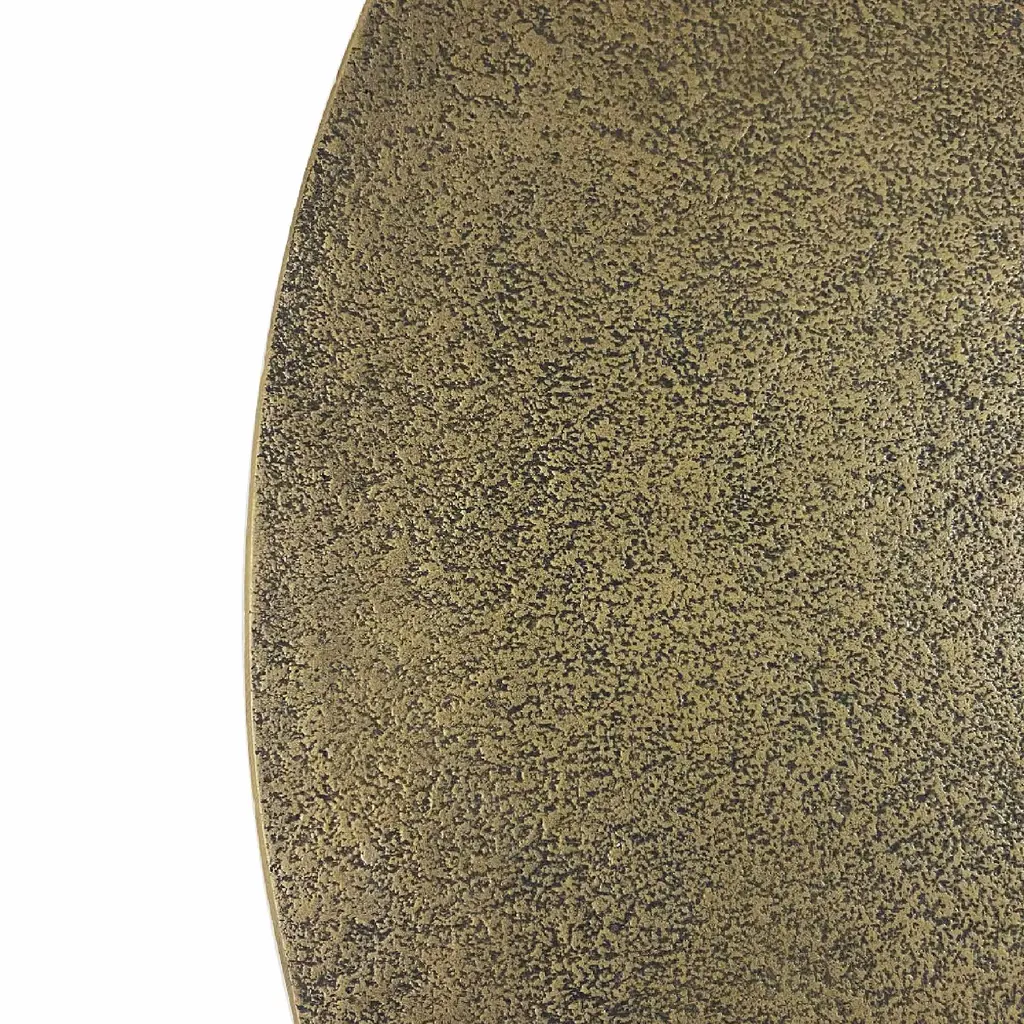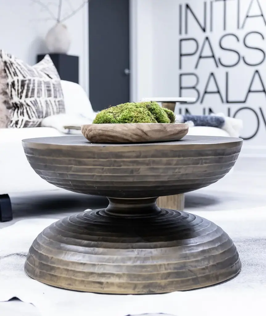 Crafted with solid aluminum, this coffee table makes a bold statement with its iconic hourglass shape and antique finish. A work of functional art in a modern, global style, this sculptural coffee table is handcrafted from metal with an organic, ripple-textured surface. This unique artisan detail is achieved by hand, using a brass electroplating technique to create a finish that will age with time, giving the look of a natural brass patina.