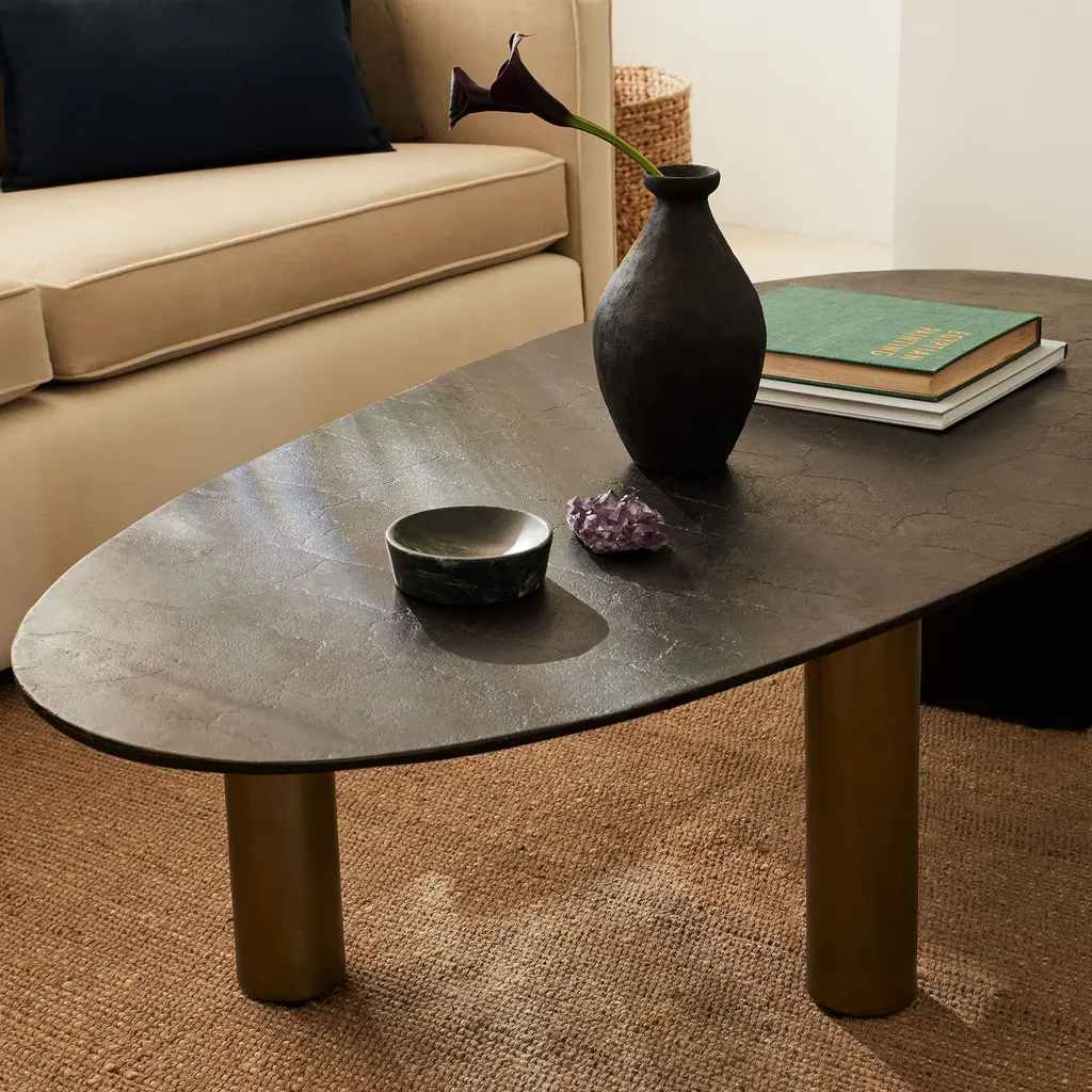 Industrial style meets organic shapes. Brings a unique look to any living room. Oval-shaped top holds snacks, drinks & games. Worn-in lines add a rustic touch.