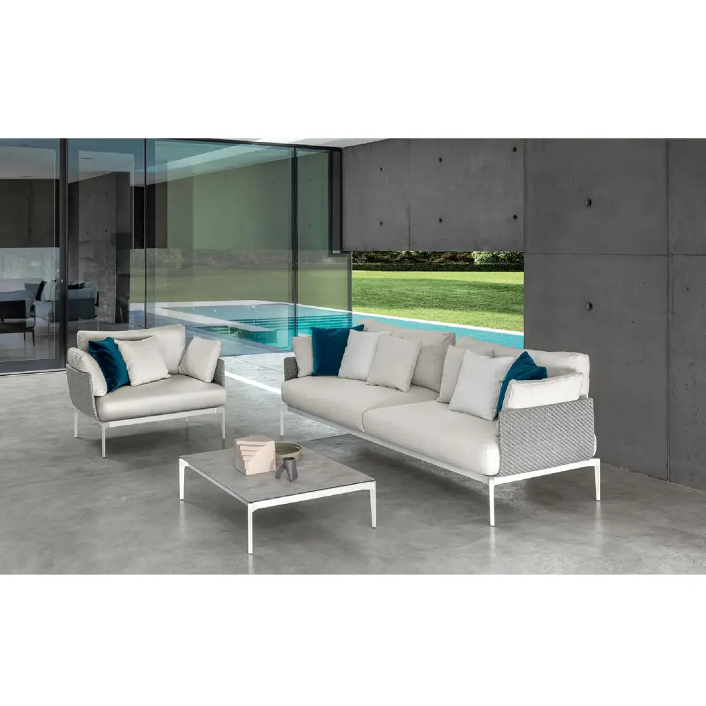 The Leaf coffee table is the smallest of the collection. The aluminium frame combined with the vitter top has been inspired by the light and suspended lines characterizing the sofa, the chair and the armchair. The coffee table of the Leaf collection has compact dimensions with an elegant and functional design, suitable for a natural environment.