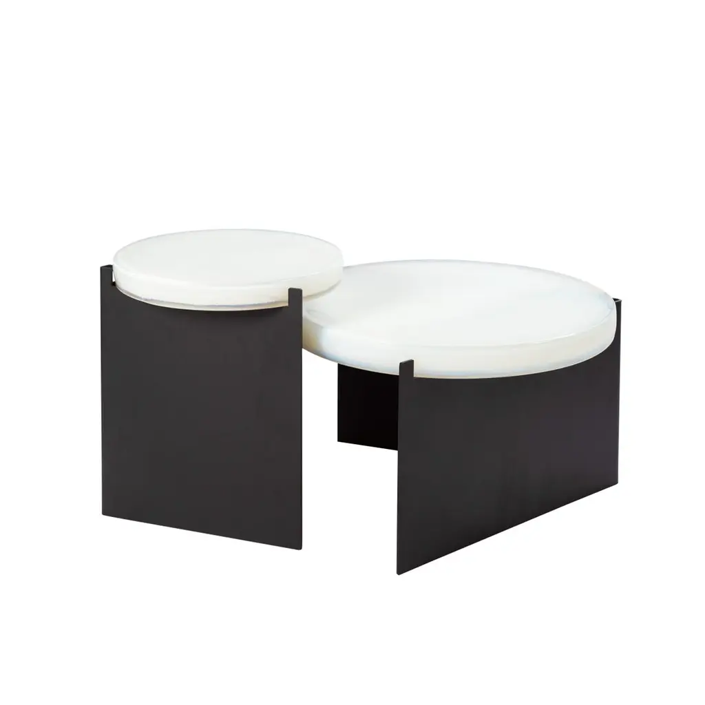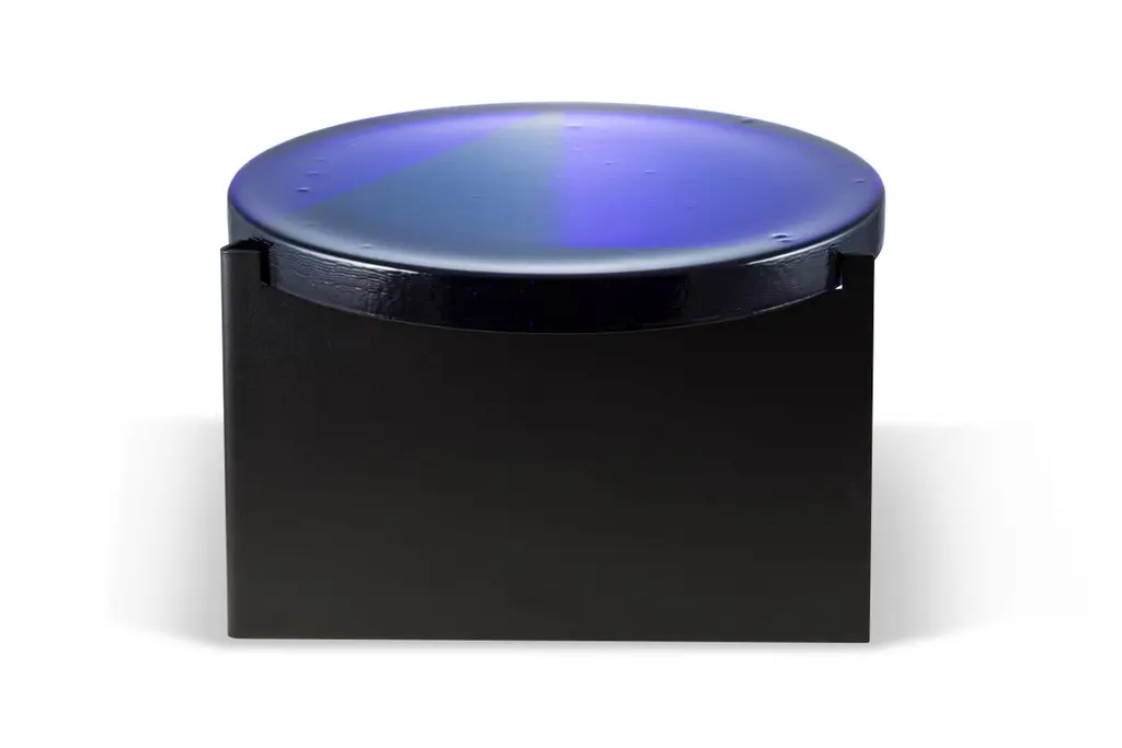 Alwa one big blue black coffee table by Pulpo.Dimensions: D56 x H35 cm.Materials: Casted glass; powder coated steel.Also available in different finishes. Normally, glass is regarded as being lightweight with sharp edges. In contrast, Sebastian Herkner’s alwa is massive and possesses gentle contours. The raw, hot, glass mass with its natural bubbles is an imprint of the structure, including the uneven, sensitive surface. So nice to touch … but also ideal for placing a variety of items.Pulpo is a design editor for high-end products in the home sector.Design is our passion. Art is our engine. We are fascinated by the craft of the ceramic and glassblowing workshops and are guided by the rough aesthetics of these unique pieces.Pulpo’s philosophy goes back to the idea of ??the “carte blanche”. Our designers and artists develop their designs freely and experimentally. A variety of materials and a weakness for structures are our strengths.The headquarters of pulpo is in Weil am Rhein, near the Swiss border. Consisting of the creative and sales department, warehouse and logistics, this is the think tank for our artists and designers. pulpo’s dealer network extends far beyond Weil am Rhein – from Iceland and Dubai to Australia.Pulpo is movement – is possibility – is passion.In 2006, pulpo was founded by Ursula and Patrick L’hoste as a design brand at the interface between shape and material. pulpo’s conception is to edit lighting, furniture and accessoires on editor’s choice. The company’s focus is to conduct up-and-coming designers and selected manufacturers, using the nature of material’s to form the score. Materials such as ceramics, stone and especially glass, which is pulpo’s primary focus since 2013.