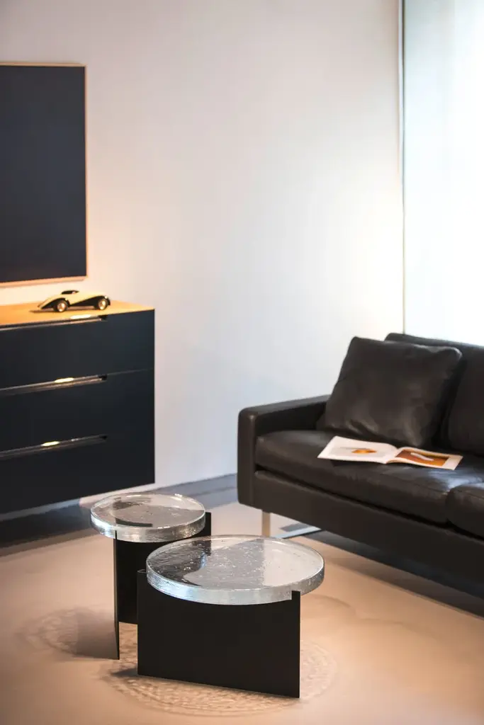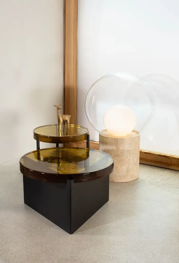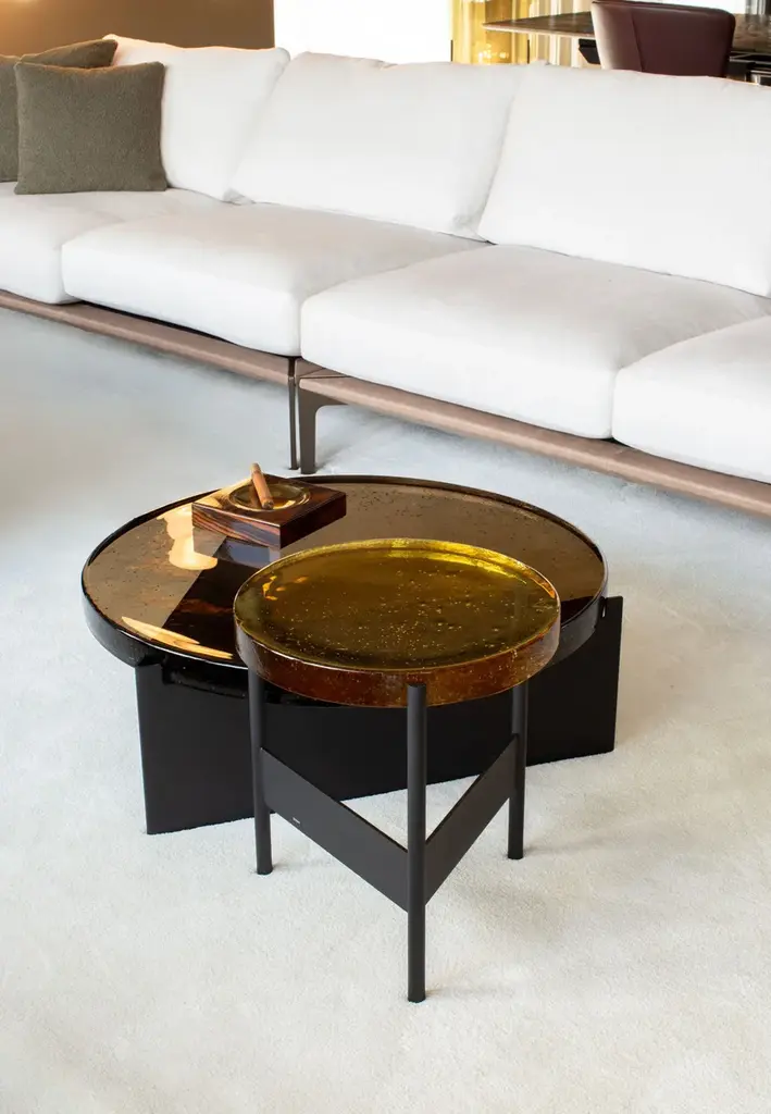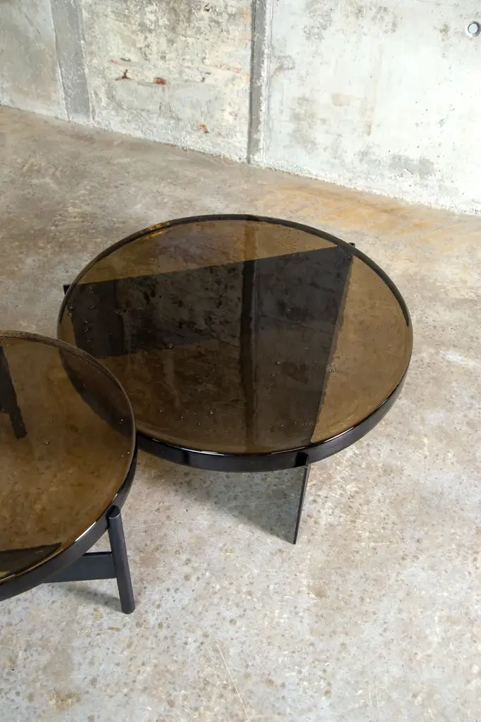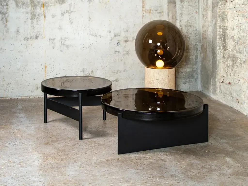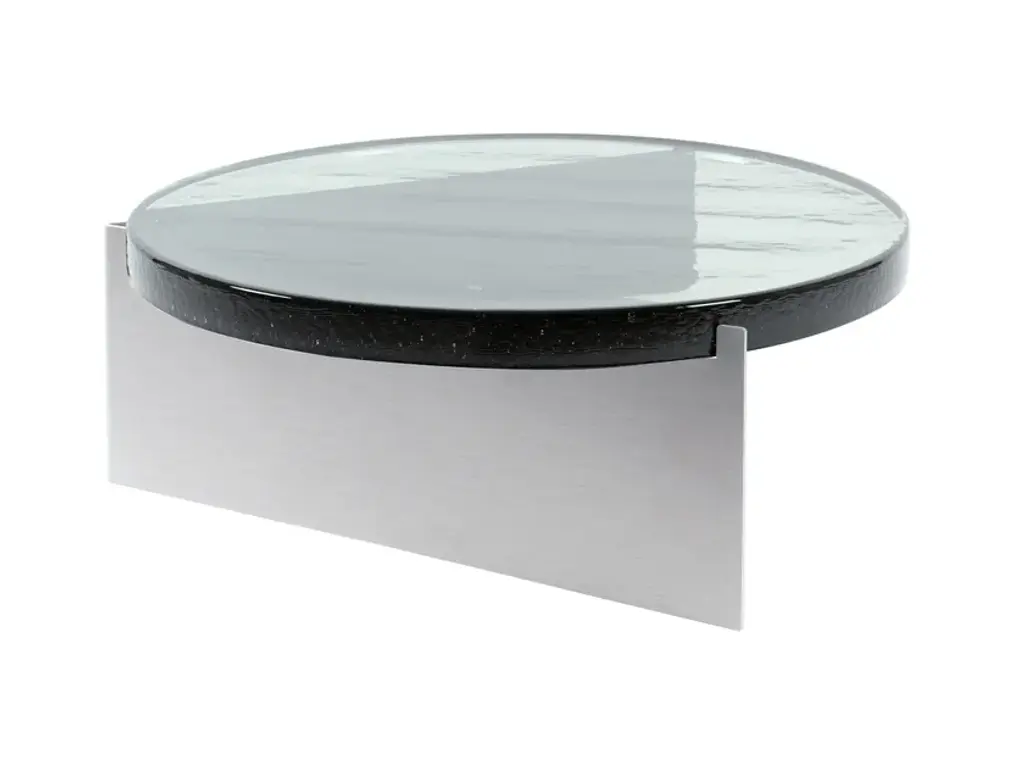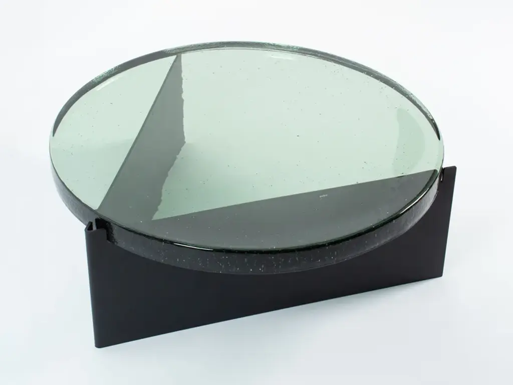 Sitting atop a simple bent sheet of steel, the alwa one side table lets its glass top shine brightest; a unique snapshot highlighting each ripple and twirl of the cast glass form. Cauoht in time, its tactile structure demonstrates softness within its bold structure.Championing imperfection. Celebrating the beauty of each unique ripple, bubble and swirl. The alwa collection of coffee and side tables traps the movement of glass in a generous time capsule. Inspired by undulating surface water, the collection mixes a sturdy form with a soft aesthetic. Sitting atop a simple sheet metal section - or the option of thin metal legs, the alwa collection is available in two sizes and a range of clear and coloured glass tops.