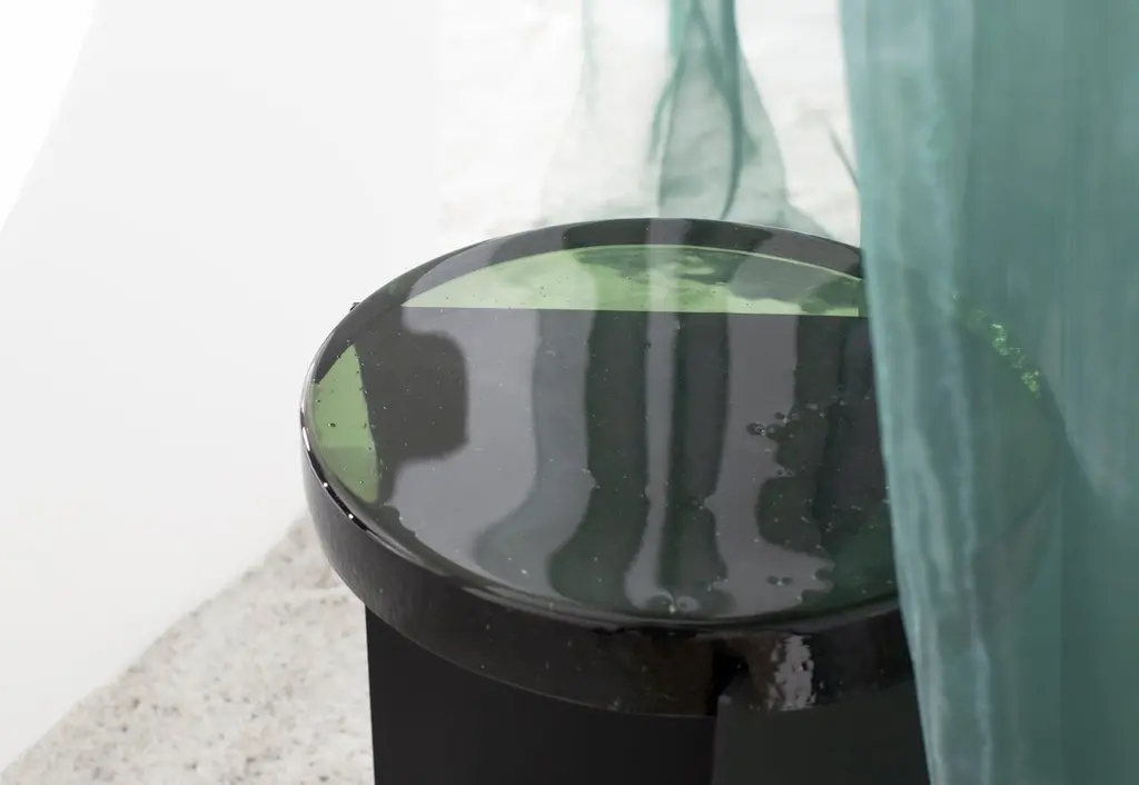 Alwa one big green black coffee table by Pulpo.Dimensions: D56 x H35 cm.Materials: casted glass; powder coated steel Also available in different finishes.Normally, glass is regarded as being lightweight with sharp edges. In contrast, Sebastian Herkner’s alwa is massive and possesses gentle contours. The raw, hot, glass mass with its natural bubbles is an imprint of the structure, including the uneven, sensitive surface. So nice to touch but also ideal for placing a variety of items.Pulpo is a design editor for high-end products in the home sector.Design is our passion. Art is our engine. We are fascinated by the craft of the ceramic and glassblowing workshops and are guided by the rough aesthetics of these unique pieces.Pulpo’s philosophy goes back to the idea of ??the “carte blanche”. Our designers and artists develop their designs freely and experimentally. A variety of materials and a weakness for structures are our strengths.The headquarters of pulpo is in Weil am Rhein, near the Swiss border. Consisting of the creative and sales department, warehouse and logistics, this is the think tank for our artists and designers. Pulpo’s dealer network extends far beyond Weil am Rhein – from Iceland and Dubai to Australia.Pulpo is movement – is possibility – is passion.In 2006, pulpo was founded by Ursula and Patrick L’hoste as a design brand at the interface between shape and material. pulpo’s conception is to edit lighting, furniture and accessoires on editor’s choice. The company’s focus is to conduct up-and-coming designers and selected manufacturers, using the nature of material’s to form the score. Materials such as ceramics, stone and especially glass, which is pulpo’s primary focus since 2013.