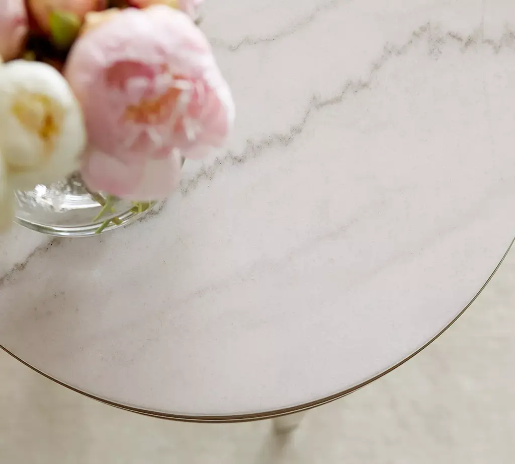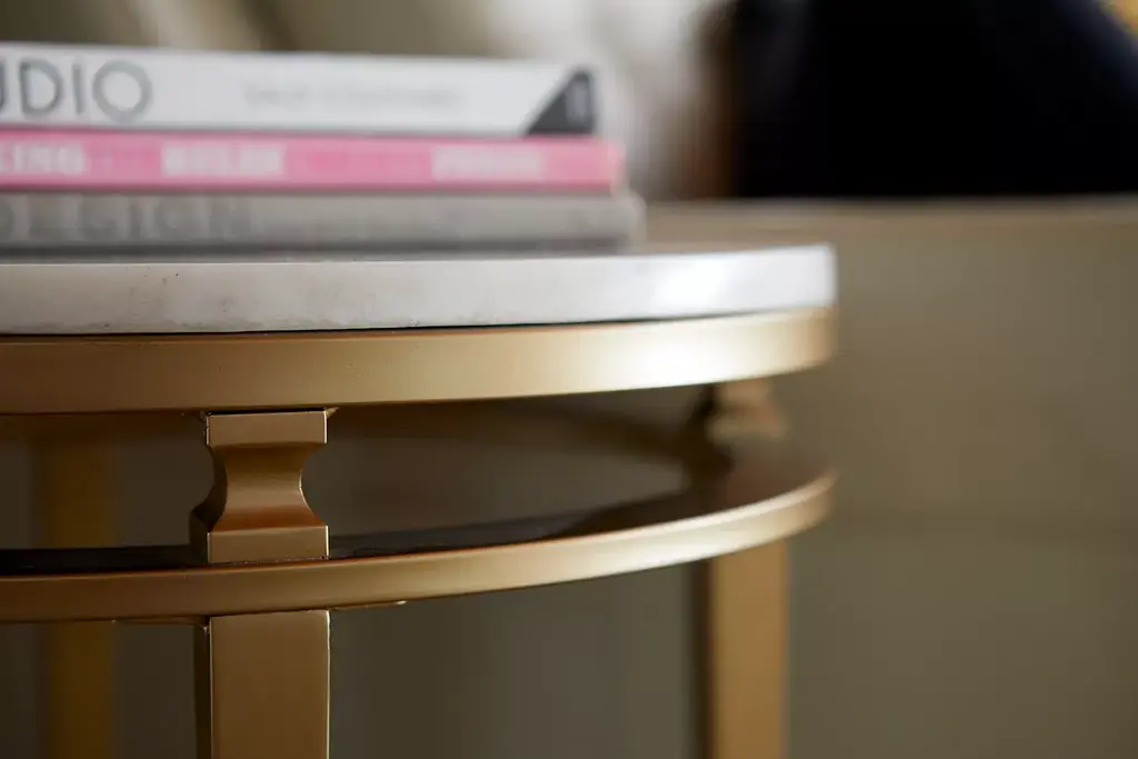 Our finely crafted Amani round coffee table brings upscale style to your space in a snap. The gorgeous, white stone top serves as the perfect backdrop for your favorite tabletop décor, while the golden finish on the metal base completes this piece's sophisticated look.