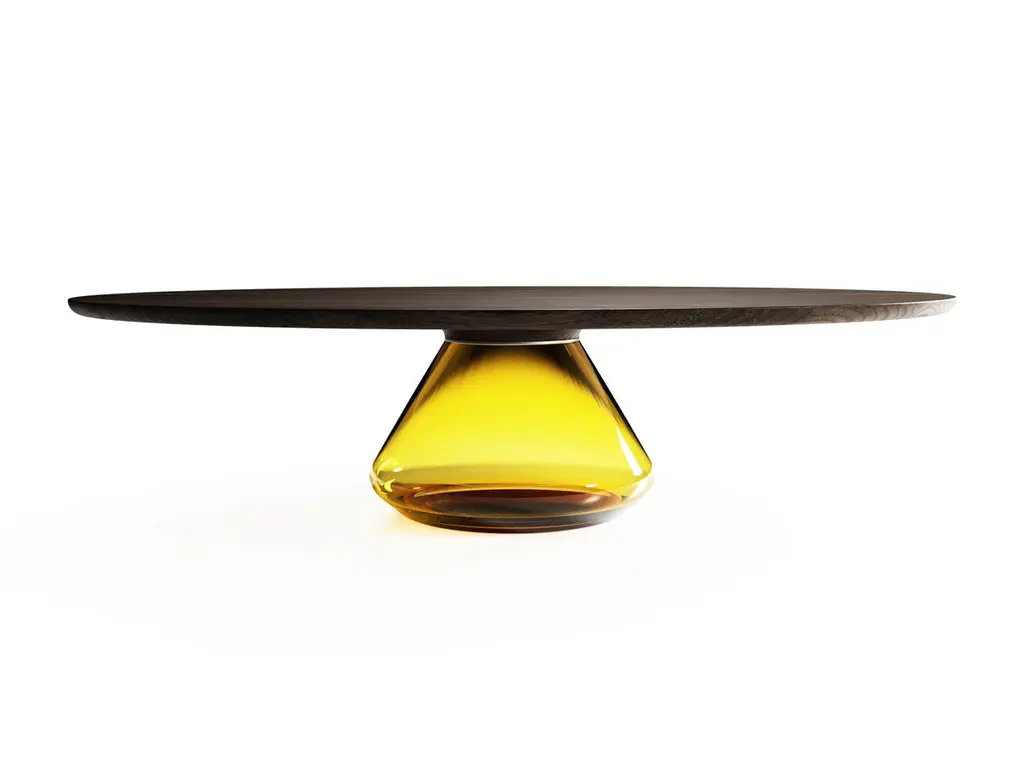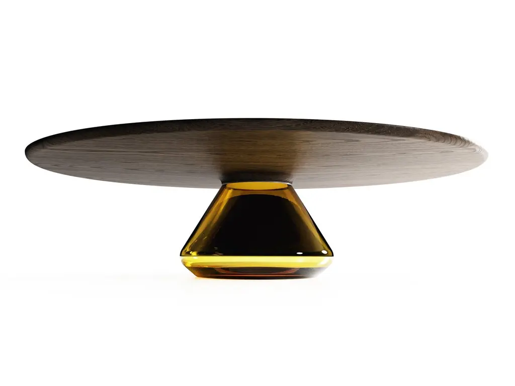 The Amber Eclipse I, limited edition coffee table by Grzegorz MajkaLimited Edition of 8Dimensions: 54 x 48 x 14 inMaterials: Glass, oakThe total eclipse of every interior? With this amazing table everything is possible as with its Minimalist style it will definitely eclipse all things around, spreading its hidden beauty. Focusing on arresting things not seen from the very first perspective inspired to create the piece of work called The Eclipse. When finally noticed attracting all the recipients by its unique form.New application and new ideas? Why not to use the glass but the other way round as it is typically done with Classic tables, glass top and the glass base?As a result of this idea we can admire the solid and beautiful tempered smoked glass top sustained by glamorous handmade glass base. When joined together the exclusive and elegant coffee table came to light.Grzegorz Majka is a self-taught Polish artist who explores the concepts of modularity, sculptural form, and artisanal processes in the design of furniture and lighting. His work seamlessly blends craft and contemporary design, incorporating high-quality noble materials like natural stone, wood, metals, and hand-blown glass. Guided by a deep respect for the inherent character of materials, Grzegorz highlights natural irregularities, textures, and patterns - veins in stone, the living patina of untreated metals, the organic feel of brushed surfaces. These elements are not hidden but embraced, inviting collectors on a sensory journey through touch and time.His studio practice focuses on handcrafted limited-edition furniture that is not only functional, but also living, authentic, collectible art.