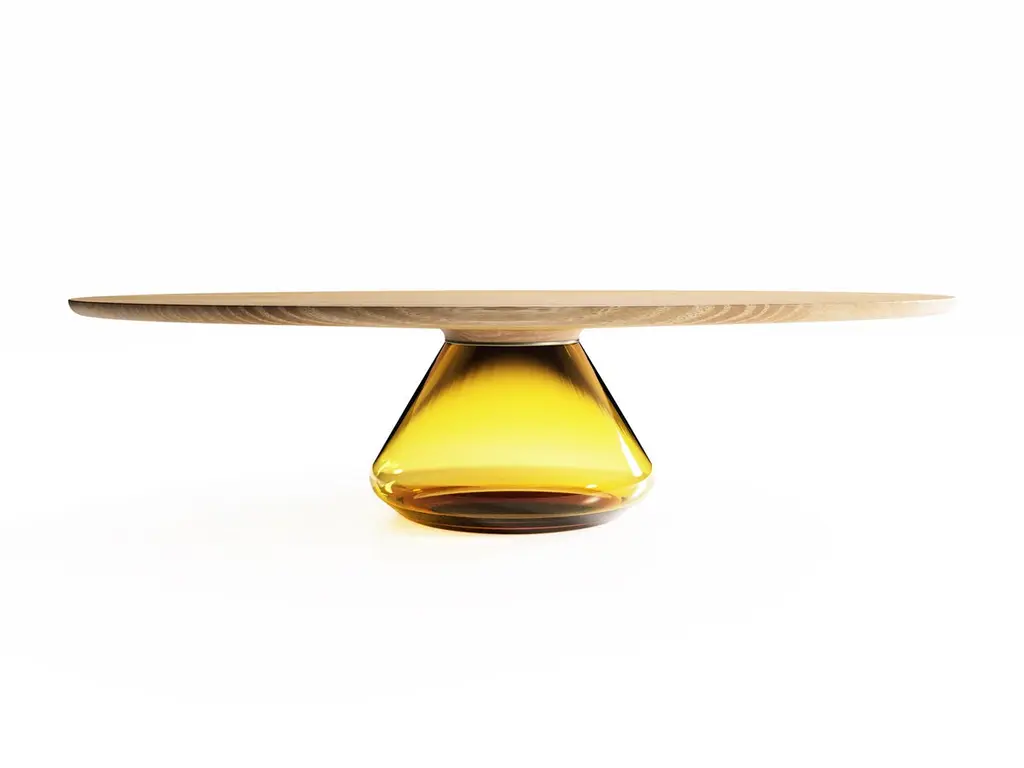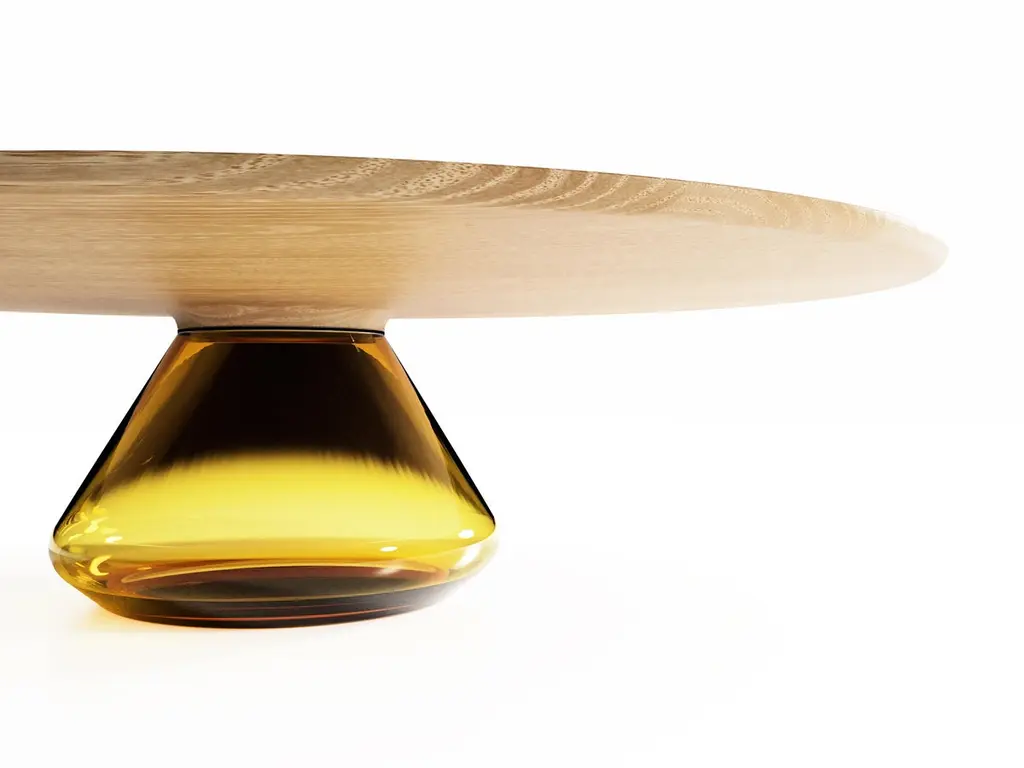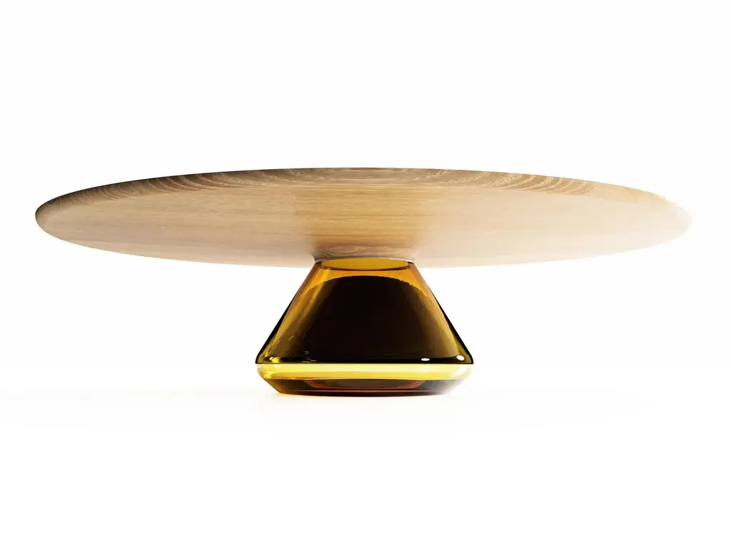 The Amber Eclipse I, Limited Edition coffee table by Grzegorz MajkaLimited Edition of 8Dimensions: 54 x 48 x 14 inMaterials: Glass, oakThe total eclipse of every interior? With this amazing table everything is possible as with its Minimalist style it will definitely eclipse all things around, spreading its hidden beauty. Focusing on arresting things not seen from the very first perspective inspired to create the piece of work called The Eclipse. When finally noticed attracting all the recipients by its unique form.New application and new ideas? Why not to use the glass but the other way round as it is typically done with Classic tables, glass top and the glass base?As a result of this idea we can admire the solid and beautiful tempered smoked glass top sustained by glamorous handmade glass base. When joined together the exclusive and elegant coffee table came to light.Grzegorz Majka is a self-taught Polish artist who explores the concepts of modularity, sculptural form, and artisanal processes in the design of furniture and lighting. His work seamlessly blends craft and contemporary design, incorporating high-quality noble materials like natural stone, wood, metals, and hand-blown glass. Guided by a deep respect for the inherent character of materials, Grzegorz highlights natural irregularities, textures, and patterns - veins in stone, the living patina of untreated metals, the organic feel of brushed surfaces. These elements are not hidden but embraced, inviting collectors on a sensory journey through touch and time.His studio practice focuses on handcrafted limited-edition furniture that is not only functional, but also living, authentic, collectible art.