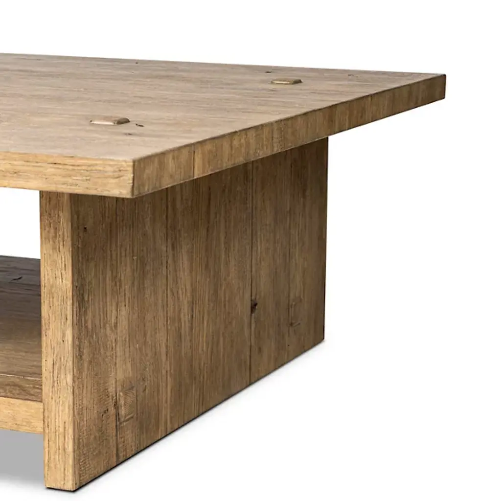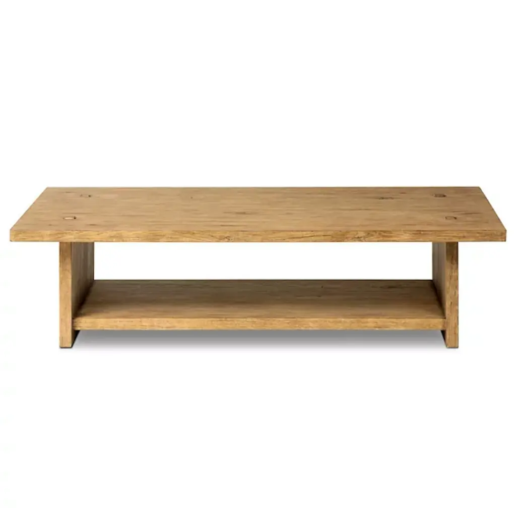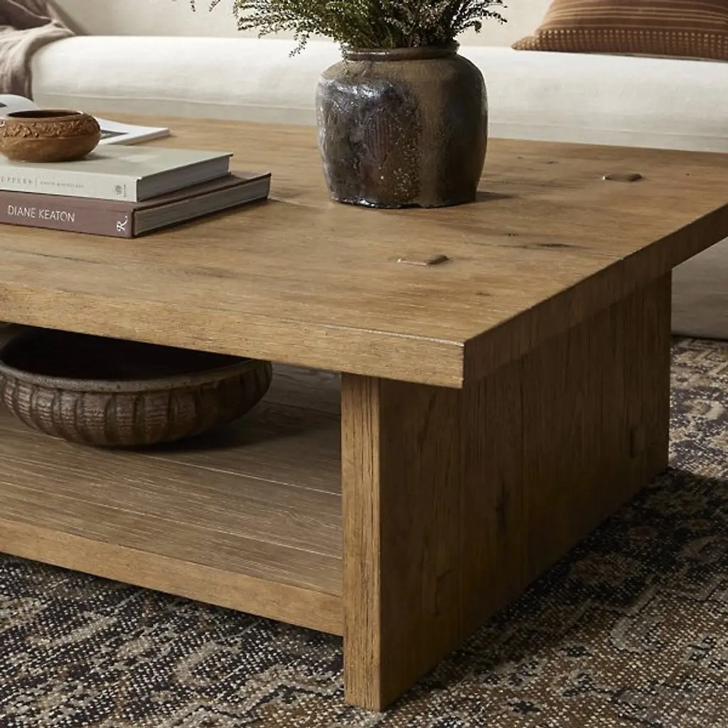 The Amber Lewis x Four Hands Zeno Coffee Table reveals traditional craftsmanship through distinctive pull-through joinery at each corner. This paneled design showcases the natural character of distressed oak with authentic knots and grain patterns that tell the story of the wood's origin. The rectangular top maintains clean lines while providing ample surface area for books, drinks, and decorative objects. A practical lower shelf offers additional storage without sacrificing the open feel. This table anchors conversation areas with understated refinement and honest materials.