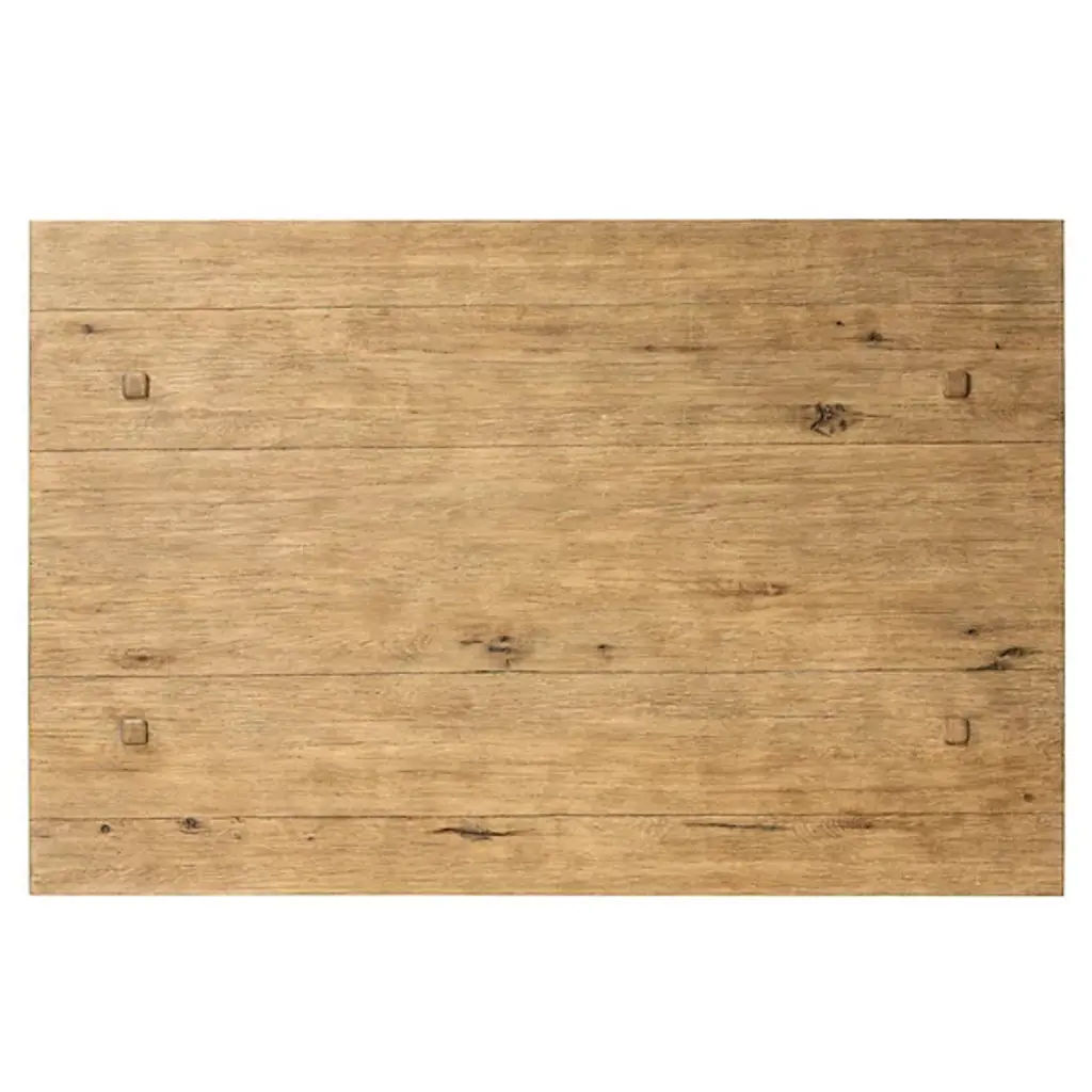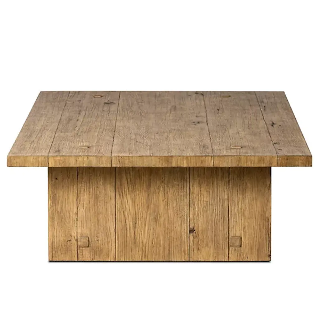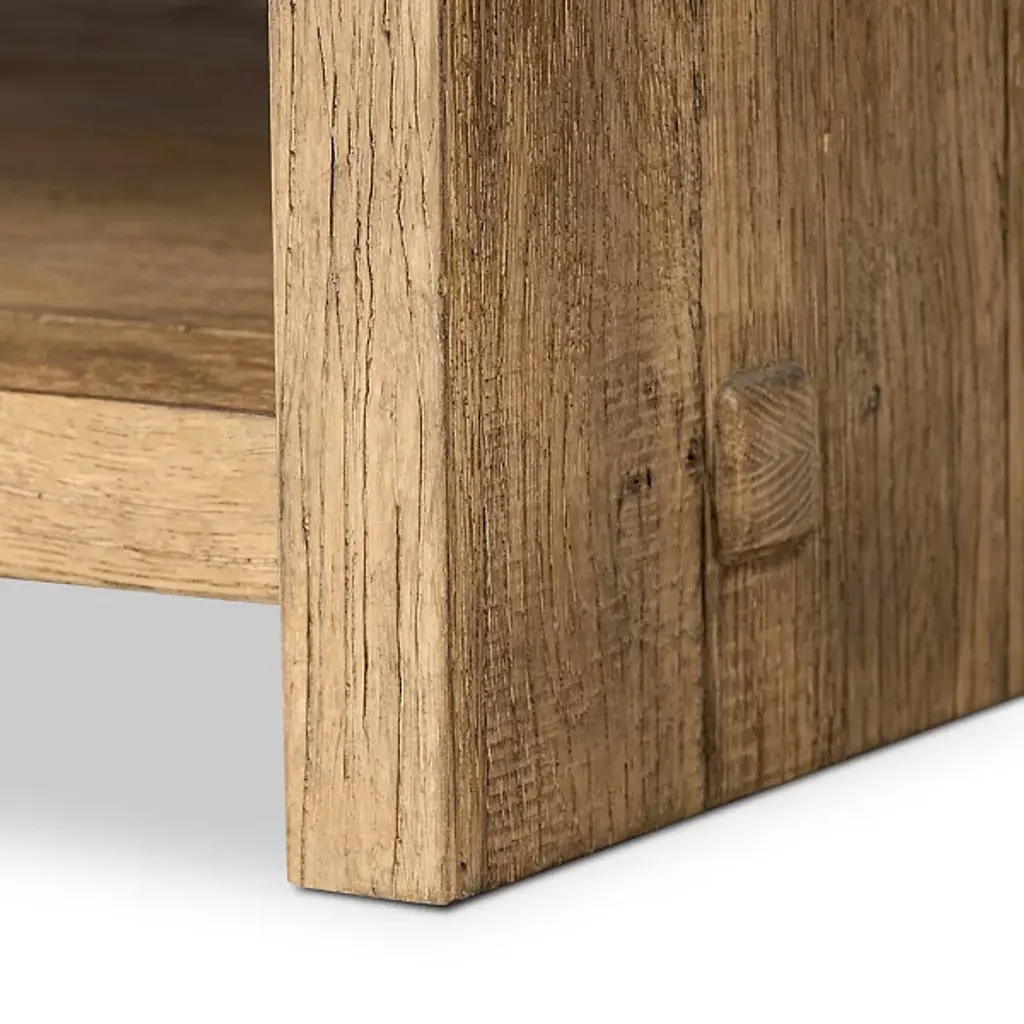 The Amber Lewis x Four Hands Zeno Coffee Table reveals traditional craftsmanship through distinctive pull-through joinery at each corner. This paneled design showcases the natural character of distressed oak with authentic knots and grain patterns that tell the story of the wood's origin. The rectangular top maintains clean lines while providing ample surface area for books, drinks, and decorative objects. A practical lower shelf offers additional storage without sacrificing the open feel. This table anchors conversation areas with understated refinement and honest materials.