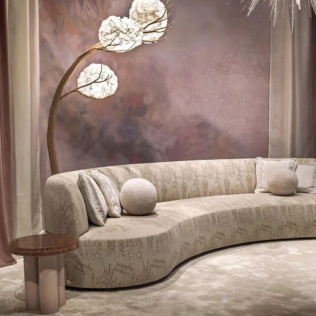 Intriguing and refined in its deliberately exposed layered aesthetic, this round coffee table treasures precious sartorial inserts speaking to its femininity. A cluster of three cylindrical metal legs sustains the transparent resin top with globed rouched antiqued-pink fabric - flaunting minute pale Pink embroideries. Please explore the Artemest catalog for available variants.
