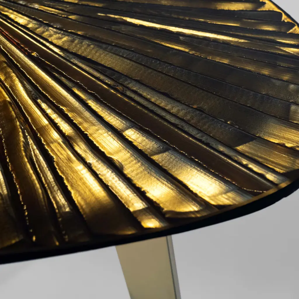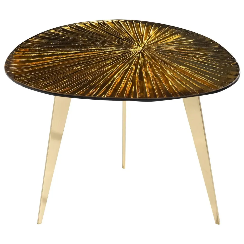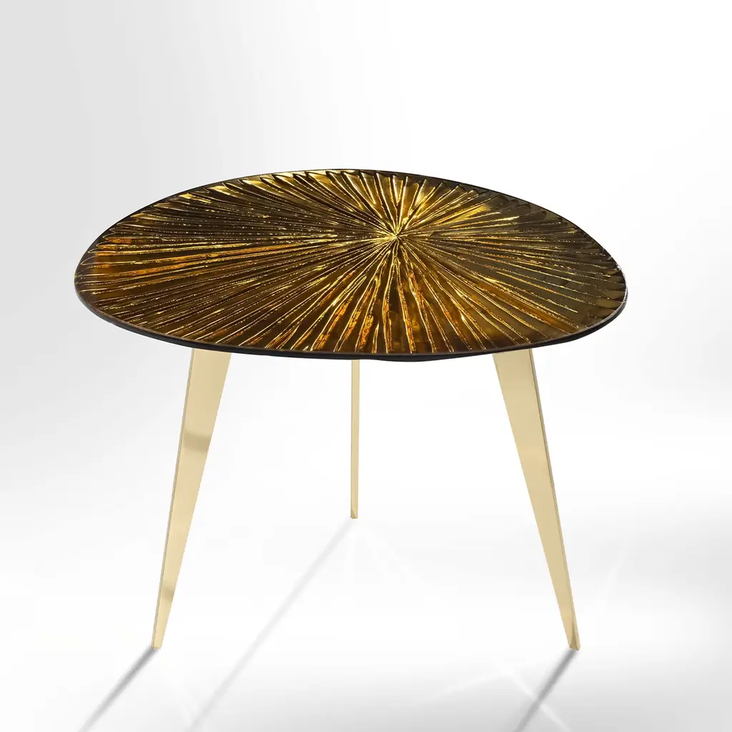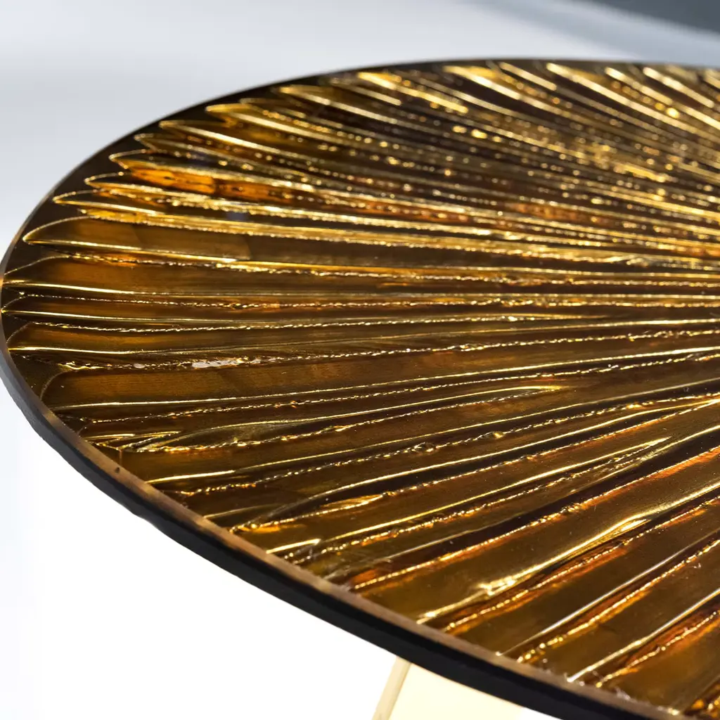 The Ambra coffee table is the solution for elegant and refined furnishings, with warm and seductive tones. The entire support structure is made of brass. The legs have a polished brass finish while the underplate is matt black. The crystal top in the shape of a rounded drop has been hand-engraved at the bottom. The finish is an amber color with intense golden reflections. Every piece is unique and due to handcrafting, slight changes may occur.