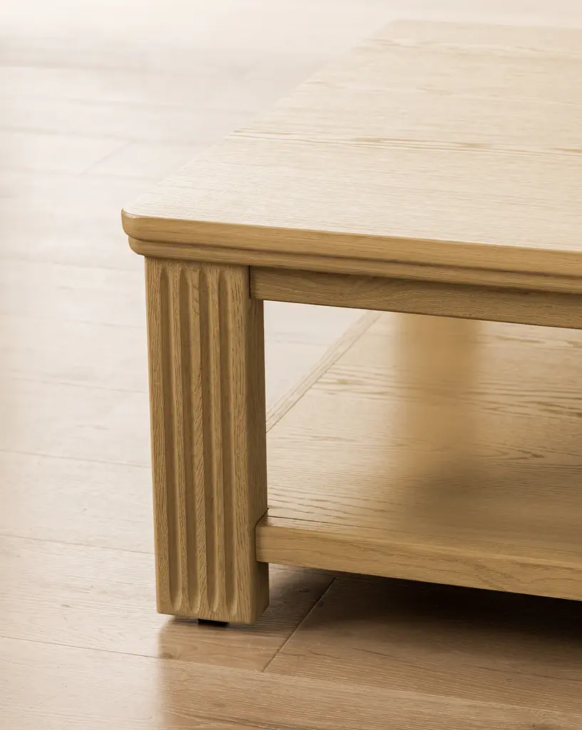 Featuring our exclusive Drift Oak finish, we designed the Ambrose Coffee Table to bring a traditional yet organic feel to your living room. The frame is adorned with vertical fluting and wire brushed for a textural look and hand feel, adding detail and character to its simple structure. With a long rectangular tabletop and a natural charm, the vintage-inspired coffee table is warm and inviting.