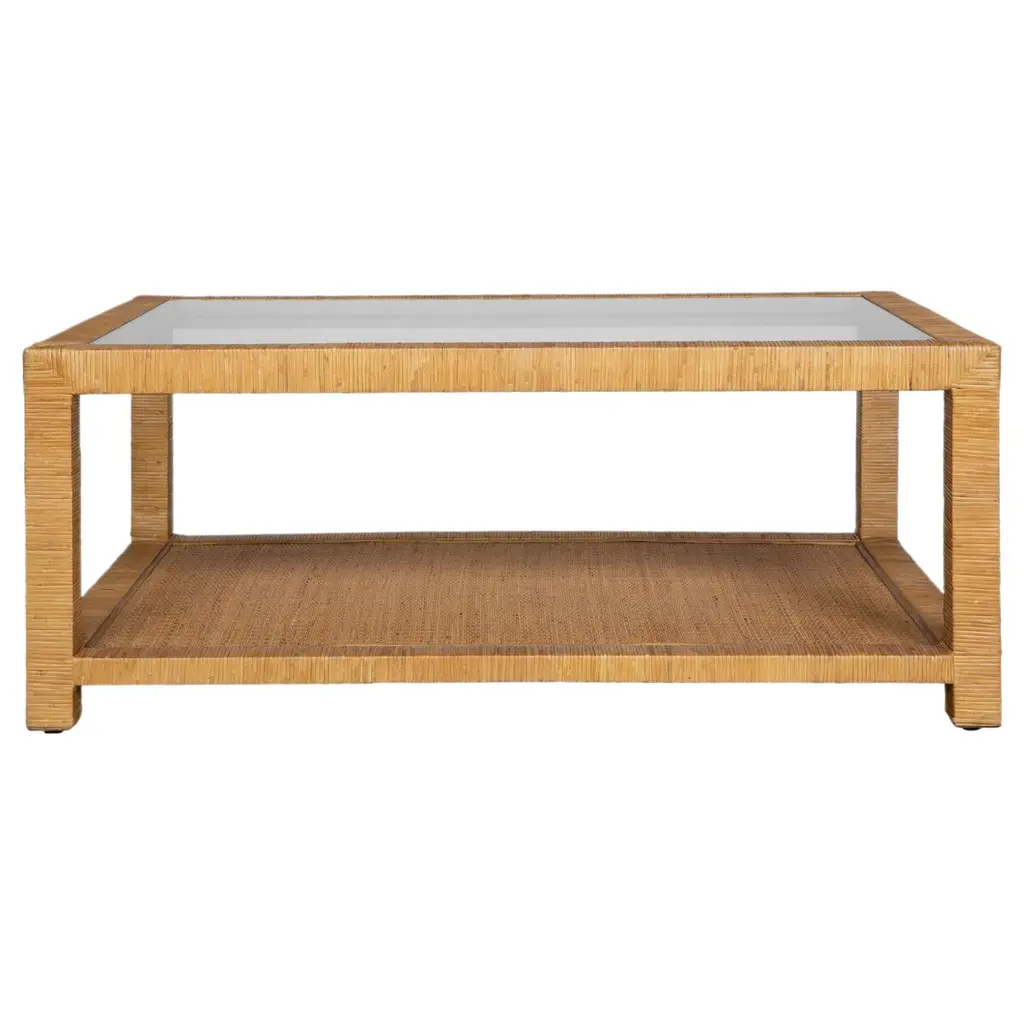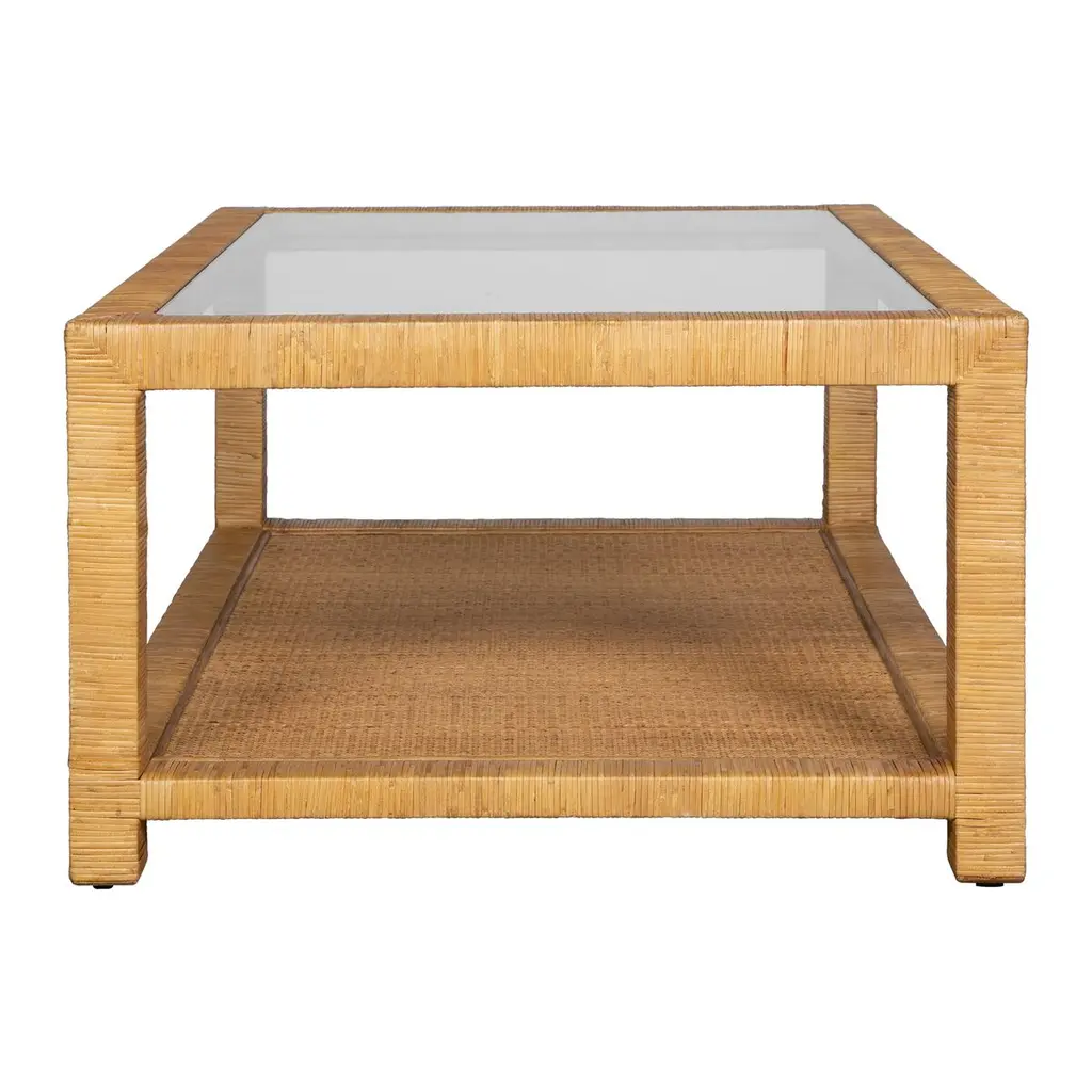 The Amelie Coffee Table invites you to indulge in the art of relaxation, where every moment spent around it becomes a cherished memory. Its generous display space beckons you to showcase your most treasured items, while the rustic charm of its design whispers tales of timeless elegance. The natural rattan wrap finish envelops the table in a warm embrace, creating an inviting atmosphere that draws you in. Atop this masterpiece, a sleek glass surface glistens, reflecting the beauty of its surroundings and adding a touch of sophistication. This coffee table is more than just a piece of furniture; it is a testament to the beauty of simplicity and the allure of nature, promising to be the heart of your living space.
